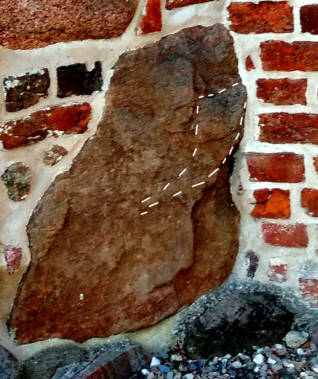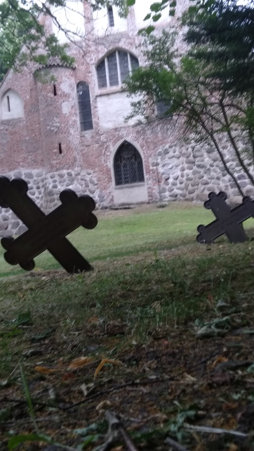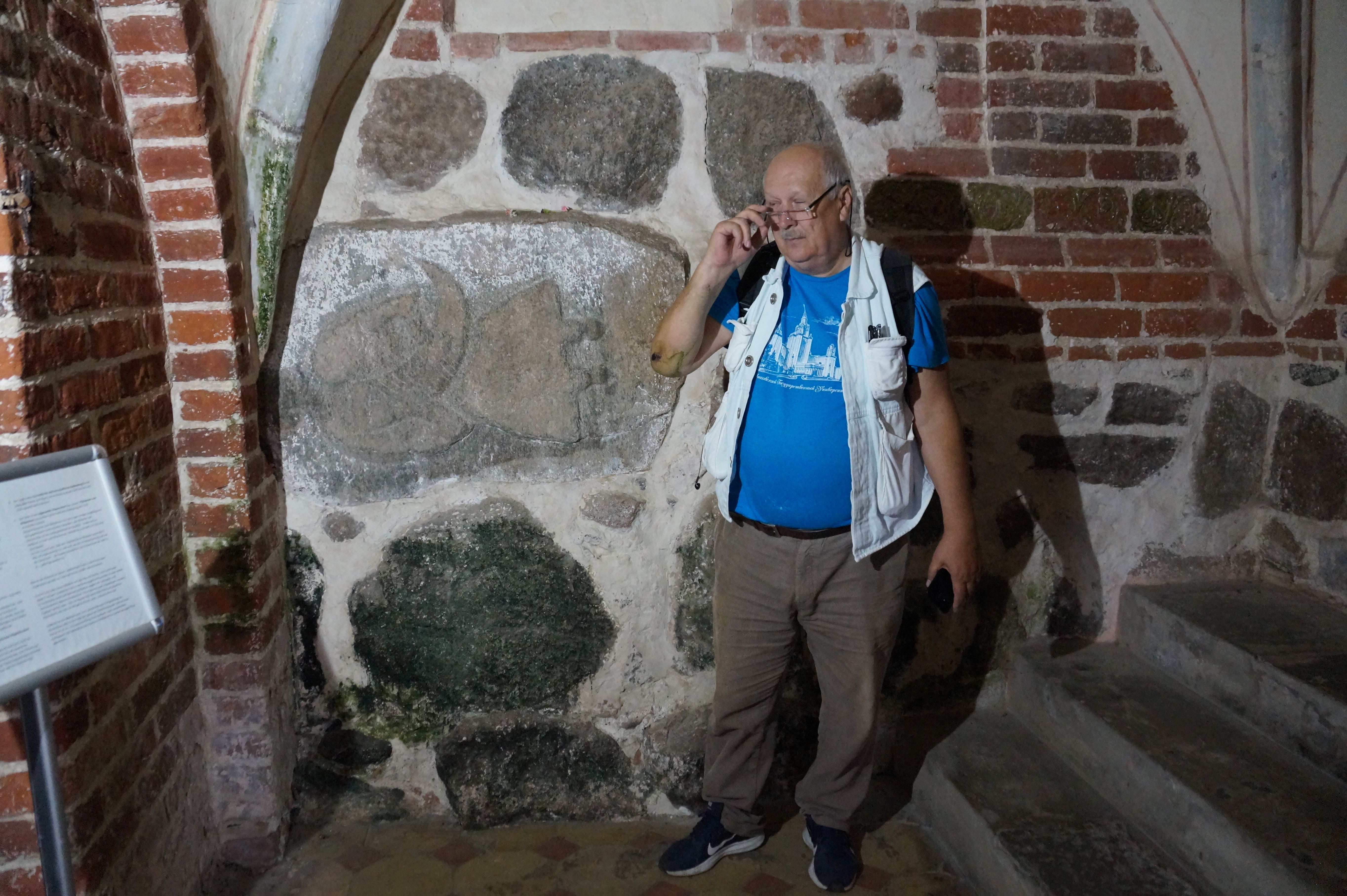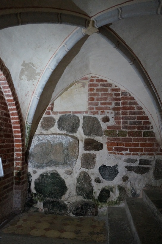 Что бросилось в глаза сразу. Опять как и на Рюгене огромные валуны в основании кирхи. Как будто и здесь церковь возведена на развалинах старого славянского храма-капища. Сама церковь на поржавевшем замке. Мы вдруг поняли, что где-то должен быть Святовид как и на развалинах храма в Арконе. И чтобы вы думали, пройдя половину периметра (то есть почти на дальне стороне, подальше от глаз) лежит один из богов славян - Световит!