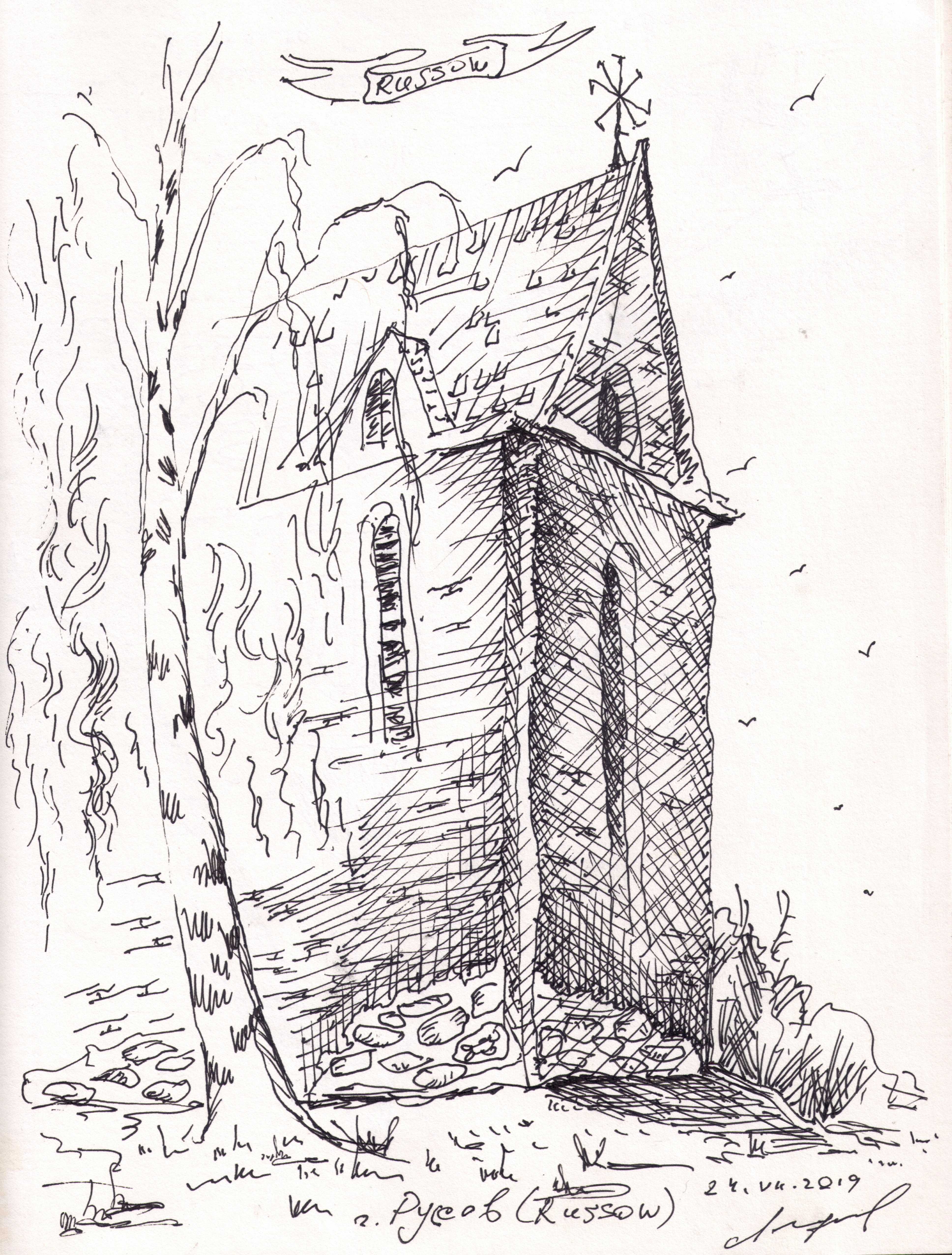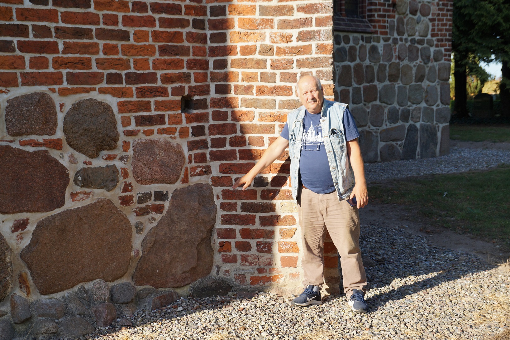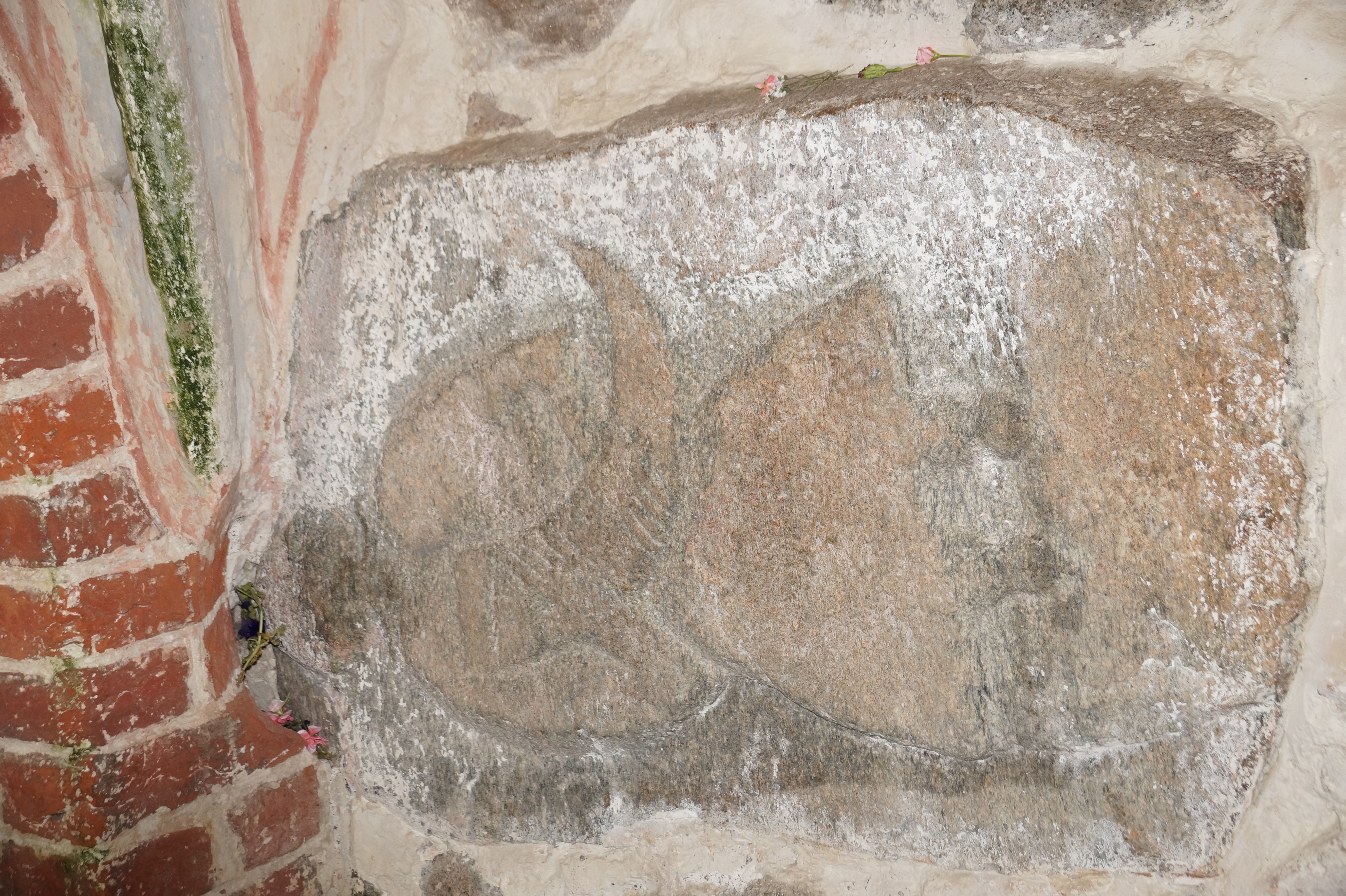 Что бросилось в глаза сразу. Опять как и на Рюгене огромные валуны в основании кирхи. Как будто и здесь церковь возведена на развалинах старого славянского храма-капища. Сама церковь на поржавевшем замке. Мы вдруг поняли, что где-то должен быть Святовид как и на развалинах храма в Арконе. И чтобы вы думали, пройдя половину периметра (то есть почти на дальне стороне, подальше от глаз) лежит один из богов славян - Световит!