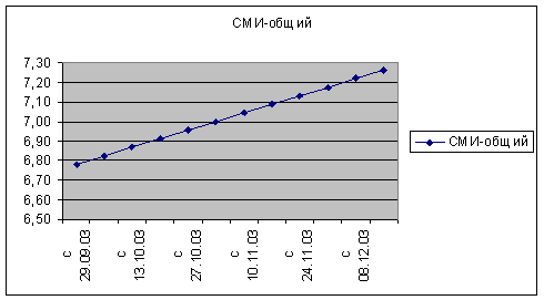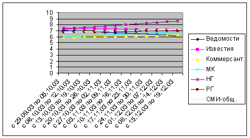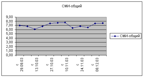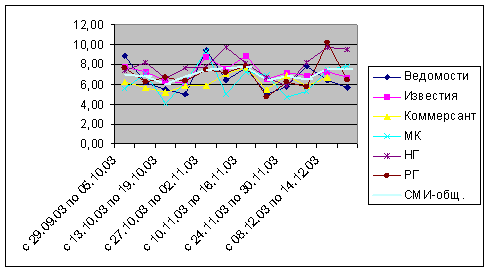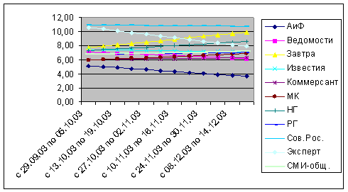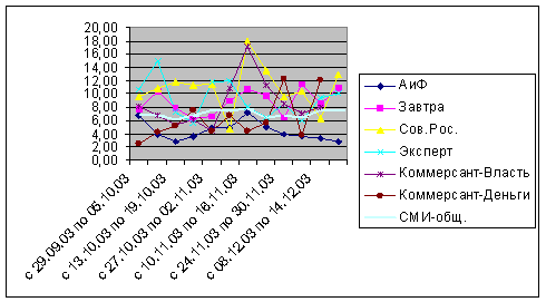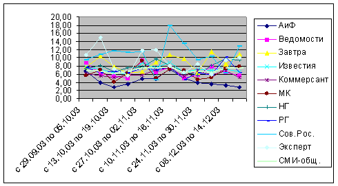 На рисунках 1а и 1б представлена сводная динамика напряженности (интенсивности негативной, соответствующей модели 'Жесткое противостояние', составляющей в информационном поле вокруг Президента РФ). Эти данные получены при анализе всех сообщений 30 ведущих федеральных газет и журналов за сентябрь-декабрь 2003 года.