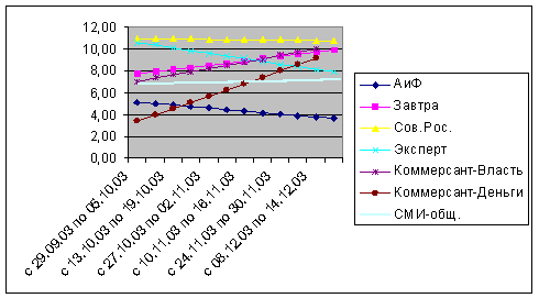 Представленные графики показывают, что в ведущих российских изданиях усиливается негативный образ Президента. Анализ информационных потоков показывает, что эта тенденция вызвана усилением негативного отношения 'элиты' к Президенту, не является случайной и имеет тенденцию к усилению.