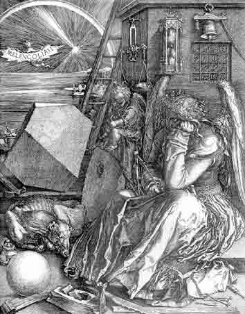 ⌠Меланхолия■ √ это ребус из символов, говорящий едва ли не каждым штрихом. Но мы ограничимся лишь пояснением к названию гравюры. Меланхоликам благоволила античность. Аристотель заметил: ⌠┘Все выдающиеся люди, отличившиеся в философии, в государственных делах, в поэзии или изобразительном искусстве, √ меланхолики, некоторые даже до такой степени, что страдают от нездоровья, вызванного черной желчью■. Но средневековье отнеслось к ним с опаской. Одна из известных немецких гравюр 15 века, изображавшая унылого немолодого человека, подпирающего голову одной рукой, а другой сжимающего кошелек, сопровождалась следующим стихотворным признанием: