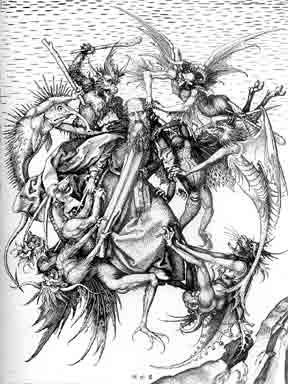 Антипод ⌠Меланхолии■ яснее всего изображен, пожалуй, в ⌠Искушении Святого Антония■ √ сюжете, который с силой наваждения воспроизводился в сознании новоевропейских художников. Самое яркое из первых его выражений √ это гравюра Шонгауэра (созданная между 1470 и 1475 гг), а дальние его отсветы видны у Гоий, Бодлера и у многих последующих живописцев ⌠сна разума■. ⌠Антоний■ √ это образ святого человека, терзаемого сонмом страстей √ страстны́х состояний. Вокруг подвижника сгустилась, откуда ни возьмись, оболочка чудовищ, ограждающая его от сферически выверенных излучений неба. Кольцо страстей зависло в пустом пространстве √ прямо над иконными горками: словно пасть ада разверзлась в воздухе. Вот прообраз дюреровского дьявола, сопровождающего его рыцаря √ страшилища, которое его герой игнорирует, пожалуй, излишне демонстративно.