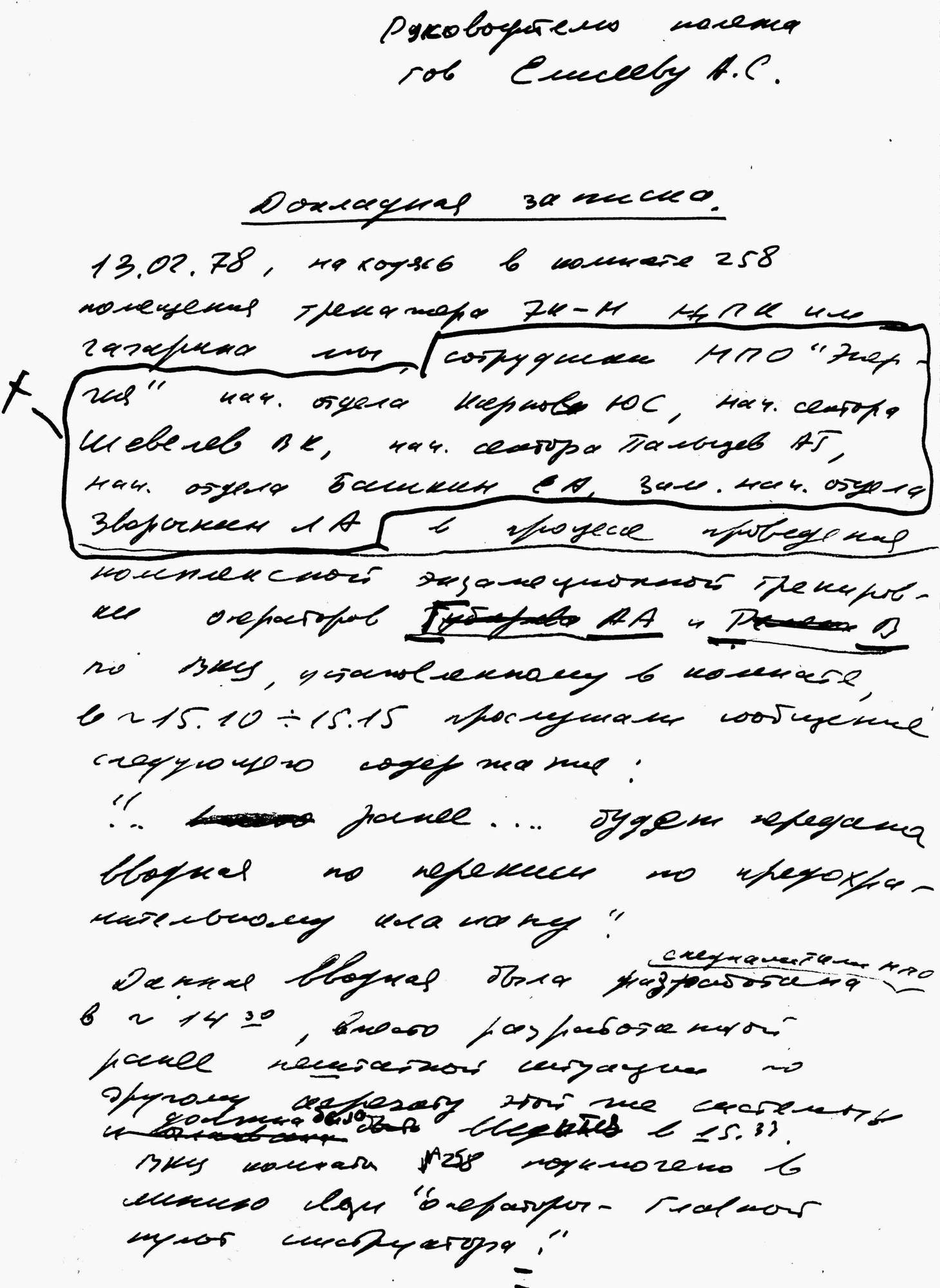 Руководителю полета тов. Елисееву А.С Докладная записка 12.02.78, находясь в комнате 258 помещения тренажера