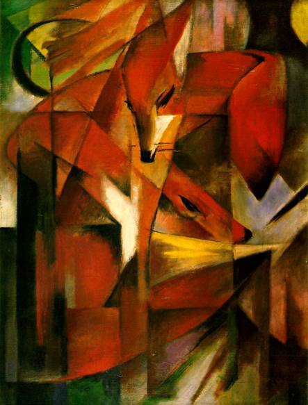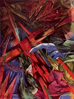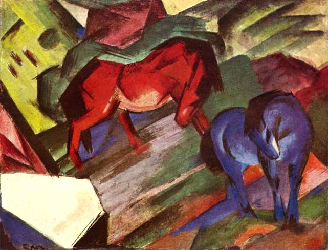 Синий конь. 1911. Можно сказать, что оба кончат переходом в абстракционизм? А это случилось. И мне кажется, я понимаю почему. Процитирую себя: ⌠Пока, при первых технологических укладах, капитализм был для масс ужасен, шли одна за другой революции. И всё √ с поражениями. Весь XIX век. Параллельно шло облагораживание капитализма. Появилось массовое производство. Оно потребовало массового потребления. Средний класс становился всё богаче и влиятельнее. И оба процесса, - через досаду р-р-революционеров и через удовлетворение мещан, - требовали индивидуализма и из ряда вон выходящих средств его выражения (отталкиваясь от коллективизма и от общепринятого). И таким, из ряда вон, стало впадание в нехудожественность, в более простое устройство своих произведений: в заражение своим чувством, в прямое внушение чувства и даже просто в неискусство √ в публицистику (для р-р-революционеров). Всё это проще, чем противоречиями вызывать противочувствия, от столкновения которых происходит возвышение чувств. √ Так что: нехудожественность итог? - Да, по-моему, во всяком случае, прямое выражение стало заметной частью структуры целого. Хоть такие нехудожественные средства и очень действенны <┘> Есть художественные направления, в само название своё взявшие соответствующие слова: экспрессионизм (экспрессия - выразительность проявления чувств)■. Революционерам не нравится пассивность людей, людям с чувством собственного достоинства √ их пошлость. Революционер же знает, ЗНАЕТ (!), как изменить жизнь к лучшему, и┘ никак с ЭТИМИ человеками каши не сваришь. Они, реформаторы, пробуют и так, и этак. Учат, просвещают, очень ненасильственно это делают, опираясь на естественность (в будущем это назвалось вальдорфской школой). √ Безрезультатно. √ Отчаяние. И можно нас возненавидеть. А другие, антагонисты этим активистам на общественном поприще, видя сразу себя выше нас, заботятся только об обособлении от нас. Оба негуманны, и можно от них ждать в крайности чего угодно.