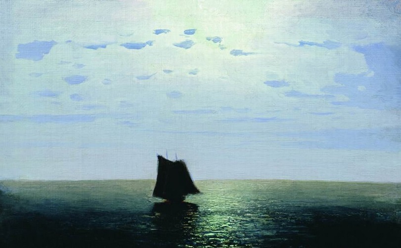 Куинджи. Лунная ночь на море. Между 1876 и 1890. Так мне на руку первая из дат. Она говорит, что перелома от романтизма к иномирию ещё не наступило. То есть романтизм – не характерный для Куинджи период. Следовательно, спрашивающий не имел право вставлять нехарактерную для Куинджи картину. Что там у него ещё? Опять о нехарактерной картине, о первой, купленной Третьяковым. Даётся её репродукция и предлагаются варианты названия. Та же история с угадкой названий для характерной и находящейся в США. Следующий вопрос, о такой картине