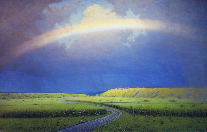 Куинджи. Радуга. 1900-1905. выводит в необходимость знания других стилей. Каприччо – архитектурные фантазии в XVII—XVIII веках и конструктивизм (возник через 10-15лет после смерти Куинджи) – вставлены для заморочки. Импрессионизм, как отображение дрожи мгновения жизни, привлёчён, по-моему, зря. Тут у Куинджи всегдашнее оцепенение выражает образ метафизического иномрия. Нечто противоположное импрессионизму, очень и очень земное выражающему. А Ар Нуво…