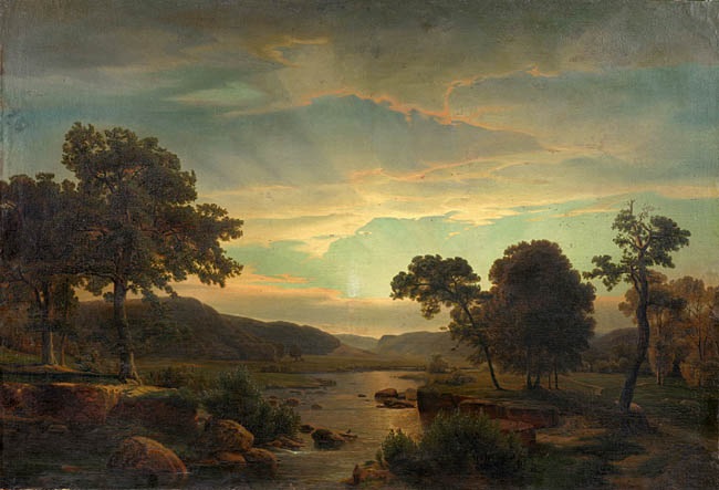 Лессинг. Романтический пейзаж. Да! Отвечаю я в полемическом задоре. Суметь семь планов найти на почти ровном месте – это отступление от натуры. Как и мрак, уже притаившийся в самом верху картины, хоть бьют лучи ещё не закатившегося солнца, даже не красные, ввиду того, что оно ещё высоко над горизонтом. Реализм ещё больше от натуры отошёл.