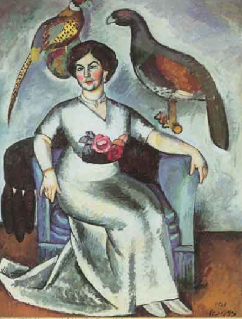 Какой-то неконтакт чувствуете? Птицы настолько далеки от нас, что совершенно невозможно что-то психологическое найти в их глазах. Так вот неопределённость и во взгляде женщины. Для пробуддизма было б лучше, наверно, чтоб она смотрела вдаль, отрешённо. Но у неё, пожалуй, даже похлеще выражение – не понятно, какое. – Как это хорошо годится для выражения идеала малочувствия… А вся эта нарочитая грубость (примитив румянца на щеках, декоративность, неаккуратность мазков…),