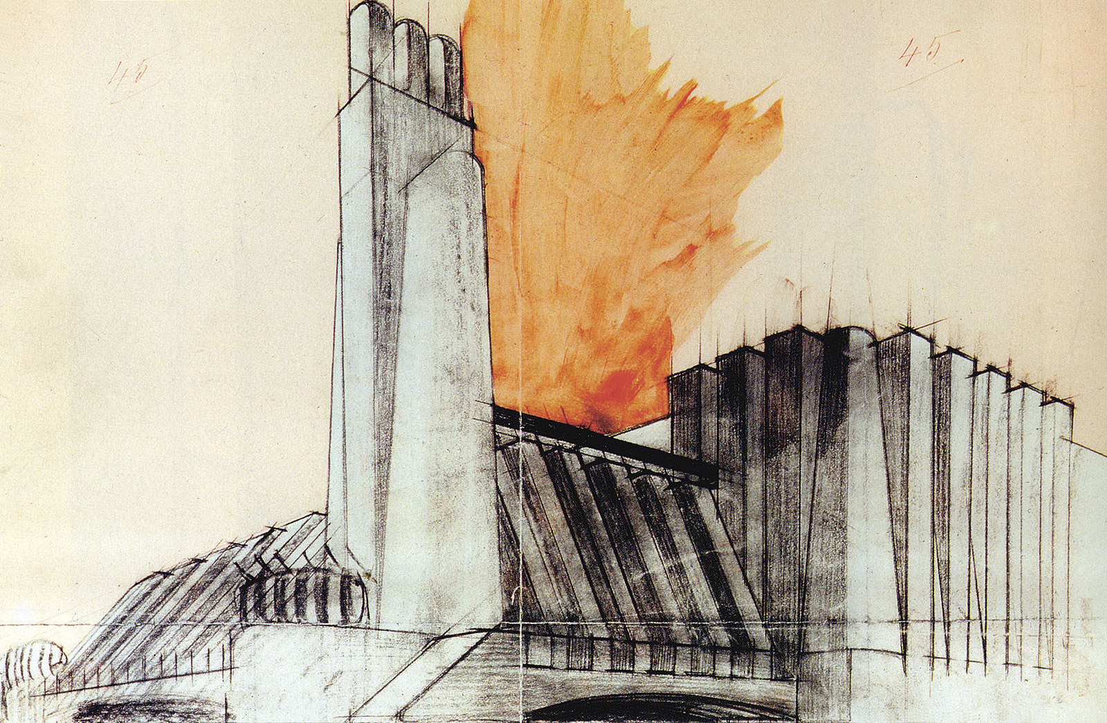 Сент’Элиа. Индустриальное здание с угловой башней. 1914. Бумага, чернила, чёрный карандаш, акварельные краски.