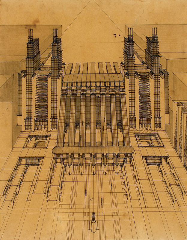 Сент’Элиа. Авиационный и железнодорожный вокзал с фуникулёрами и лифтами на трёх уровнях дороги. 1914. Чертёжная бумага, чёрные чернила, сине-чёрный карандаш.