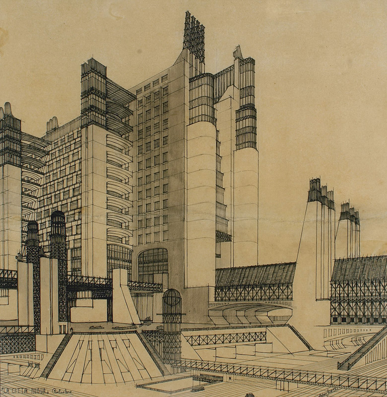 Сент’Элиа. Многоквартирный дом с наружными лифтами, галереей, крытыми проходами на трёх уровнях улицы (трамвайный путь, автомобильные полосы, освещённые пешеходные тротуары и беспроводной телеграф). 1914. Бумага, чёрные чернила, чёрный карандаш. сбивала меня с толку. Толк по-моему – это возможность отнести данные произведения к одному из малого числа подсознательных идеалов автора. Пока я не обратил внимание на нудную подробность технических нюансов в названии последней репродукции, мне подобрать подходящий из ограниченного перечня идеалов не удавалось. Забивало впечатление какой-то идеальности, что ли. Я, грешен, даже примерил на Сент’Элиа романтизм. Дюссельдорфская ж школа специализировалась на изображении таких красот пейзажных, что лично мне аж завывать от восторга хочется. Ультракрасота! Что в качестве странности укладывается в объяснение подсознательности идеала прекрасного внутреннего мира своего у романтика, в ужасе бегущего от страшного внешнего мира в прекрасный внутренний мир себя-дорогого. Но мне не удалось при запросе в поисковике: “горе Сент’Элиа” и “личное несчастье Сент’Элиа”, - ничего найти. И пришлось от романтизма отказаться. И только материальная низость, так сказать, этих лифтов, трамвайных путей, пешеходных тротуаров, железнодорожных и авиационных вокзалов и т.п. вдруг меня озарила. – Это ж половина (низкое), готовая сталкиваться с другой половиной – вознесённостью духа и строений (высокого), сталкиваться в нашей душе, чтоб рождать третье переживание, подсознательный катарсис, который переводится в слова формулой идеала типа Высокого Возрождения – Гармония низкого и высокого. Впервые патент на железобетон взят в 1854 году. Но только в ХХ веке, веке прогресса, он стал широко используемым. И открывшим гигантские возможности для строительства. Естественно, что научно-техническая революция вдохновила в связи с ним и художников. Я вот только не знаю, правильно ль Сент’Элиа называют футуристом. Ведь те очень и очень (из-за всяческих угрызений совести, связанных с прогрессом и над кем-то победами) отступали от натуроподобия. Искажали натуру. А тут никакого собственно искажения. Почти такие здания уже стали строить.