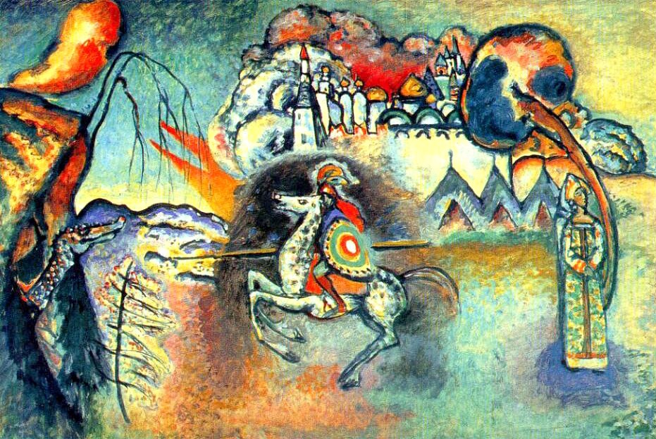 Предположим… Предположим, что Якимович прав, что: "Живопись Кандинского после 1915 года — это именно живопись [иного, чем прежде] человека…” (ЖЗЛ. Кандинский). Если, по Якимовичу же, до того у него был расцвет… И если я правильно его понимал (см. тут), как торжество Беспредметности даже над самыми бестелесными тенями жизни в Этом мире, над человеческими эмоциями, выраженными всего лишь протяжённым патетическим цветом и порхающими линиями… То скатывание с этой высоты будет возвращение к выражению нуды суеты Этого мира, лишённого протяжённой патетики цвета и порхания линий в пользу привязанности их опять, как прежде, к предметам и сюжетам, осмеиваемым "условным театральным антуражем” на темы, самые… святые для русских, среди которых он опять оказался. – Что это? – Это каша "доабстрактных “исторических фантазий” с всадниками, дамами и царевнами, церковками”. "В Третьяковке к этому разряду картин… принадлежит известная картина Кандинского “Святой Георгий и змей””. (Да простит меня Якимович за такое препарирование мною его текста, но что делать, если он на 99% не прав.)