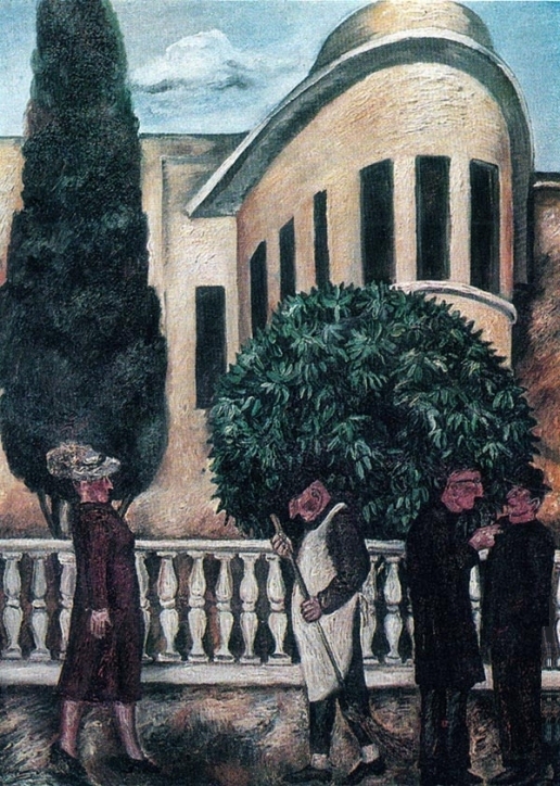 Нестерова. Дом на набережной. 1978. До меня как-то не сразу дошёл смысл слов Манина: "Поначалу внимание Нестеровой привлекали заурядные домики провинциальных улиц (“Гурзуф. Аптека”, 1970… “Дом на набережной”, 1978). Существует мнение, что художница пишет “портреты” этих ничем не примечательных зданий. Однако это больше чем портреты: дома интересуют Нестерову постольку, поскольку через них можно отразить среду обитания людей. Банальность просматривается через постройки, улицы, облик заштатного городка. Полный безвкусия скособоченный “Дом на набережной” как бы демонстрирует свою не идентичность московскому “Дому на набережной”. Ироничность такого сопоставления очевидна. Именно она постепенно перерастает в гротесковость изображения” (Русская живопись ХХ века. Т. 3). Очевидное как-то стало мне не сразу очевидным. Я сам когда-то рисовал с натуры. И во мне, наверно, засела привычка приукрашивать срисовываемое. Я б, наверно, левый угол аптеки нарисовал бы ровнее. И толщи`ны оконных проёмов (двух нижних окон) я б сделал одинаковыми. Стороны крыши над балконом – параллельными друг другу. Я сомневаюсь, чтоб я сделал по дуге стык правой стены с асфальтом. Всё это меня заставляет думать, что Нестерова портит картинку. (Не думать же, что она не умеет рисовать.) А Манин намекает, что Нестерова насмехается над убогой жизнью провинции. Может даже – над самим российским принципом резкого отличия провинции от метрополии… Я не был в Германии, но у меня впечатление, что там такого принципа нет (хотя бы из-за долгого отсутствия там централизованного государства). И Нестерова что: как упомянутый Сытин, чувствует себя немкой и говорит “фэ” Советскому Союзу? В курортном Гурзуфе (?) на набережной, значит, в центре – что: строения тоже заслуживают её “фэ”? (Когда я там был {в 1957, за 21 год до Нестеровой}, я не фыркал, хоть сам вообще-то жил в бывшей столице Литвы. Хотя… Помню, оказавшись на дороге, ведшей, как оказалось, к резиденции Хрущёва, я обратил внимание, что дорога и, главное, кюветы вдруг стали бетонными {дальше меня остановили и завернули}.) – Нестерова была вхожа, куда меня не пускали? И возмущена разницей? А человеческий типаж её тоже не устраивает? – Чего это такая идиотическая важность у дамы?.. Огромный нос у дворника? Чудовищные уши у собеседников, да и у дворника? Она расистка? Недолюди в СССР? Или вообще все обычные люди – фигня? – Едят, пьют, что-то там ещё делают… – Скука.