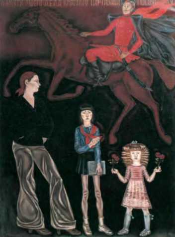 Нечитайло В. Красные Партизаны. 1980. Ведь придя в институт, он предстал перед ребятами как сын донских степей. Мы узнали из его рассказов о годах гражданской войны на Дону, о поднятой целине в Сальских степях, и он казался нам иногда парнем из легенды, о которой мы читали только в романах или стихах” (Долгополов. Мастера и шедевры. Т. 3. https://info.wikireading.ru/274332). Такое впечатление, что Василий Нечитайло вполне доволен был произведением дочери не только по формальному признаку – "Писать ярче” и "современность реалистической живописи” – но и по идейному – "любил жизнь”. Ибо революцию понимал, как созидание, а любовь к жизни и созиданию выражать естественно по его мнению – это натуроподобно. И все слепы к черноте на картине Ксении, к тому, что трое стоящих стоят так, что, в общем, не имеют отношения к тому, на каком фоне они стоят. Разве что красный свой пионерский галстук старшая девочка в руке теребит, а у младшей в руках цветочки цвета, имеющего отдалённое родство с красным – фиолетового. Правда, как и конь под легендарным дедом. Но. По-моему, тут такое воспоминание о революции, которое издевательством можно назвать. Это нарисовано за несколько лет до перестройки и гласности, когда массово стали хаять революцию, но. Ксения могла вращаться в соответствующих кругах… Много что в своей картине она отметила насмешкой (примитивизмом изображения): и дочек, как-то всё же причастных к воспоминанию о революции, и деда. (Надо ли перечислять, что именно носит черты примитивизма? – До карикатурности тонкие ноги старшей дочки, ультраподробность причёски младшей, нелепость её позы, схематичность лиц обеих, да и деда тоже, неестественность и его позы, да и коня. Да и чернота, “в лоб” обозначающая негативное отношение.) И только брюки… "В 70-е начали появляться джинсы клеш, но мне в джинсах было некомфортно. В центральном аппарате джинсы считались неприличными” (https://www.wonderzine.com/wonderzine/style/style/205237-soviet-70s). И только на брюках Ксения оттянулась как мастер живописи. Бархат нарисован натуралистически. – Даёшь вещизм! Объявленный официально врагом строя. Если что в изображении и роднит дочь и отца, так это шаблон: натуроподобием выражать своё положительное отношение. Шаблон, не имеющий ничего общего с искусством в ХХ веке. Может, на это и намекает Манин: "…рассудочно подходит к теме Ксения Васильевна Нечитайло (род. 1942) в картинах “Брат из армии вернулся” (1976), “Гурзуф начала века” (1978), “Воспоминание о революции” (1980) и др. В примитивизме сказывалась диалектика разностей, из-за чего образ или обострялся, или вообще пропадал, будучи облечен в форму, далекую от реальности. Иными словами, возникало впечатляющее противоречие между правдивым ситуационным содержанием и неправдивой или неадекватной ему визуальной формой.” (Манин. Русская живопись ХХ века).