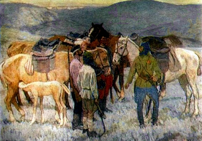 Нечитайло К. Воспоминание о революции. 1980. — Это полотно написала моя дочь Ксения, — проговорил Василий Кириллович. — Вот она на картине стоит с дочками, моими внучками, Настей и Машей. За ними на коне их прадед, мой отец Кирилл Никитович… Я глядел на своеобычный, интересно решенный холст “Воспоминание о революции” и сразу понял гордость большого мастера за свою дочь-художницу, талантливую, со своеобразным, ни на кого не похожим голосом… Пристально вглядываясь в картину и видя радость в глазах Нечитайло, я еще крепче уверовал в значимость и современность реалистической живописи, обладающей древним и вечно юным ликом. “Писать ярче” — этот завет отца не забывают и стараются исполнить дочь Ксения и сыновья Дмитрий и Сергей — молодые художники, уже по-разному заявившие о себе как дарования свежие, разные. Такова преемственность поколений. Молодые… Ведь им создавать искусство XXI века. Как важно в судьбе каждого большого мастера чувствовать рядом с собою плечо верного друга, единомышленника. Таким товарищем был у Василия Нечитайло еще с юности, с институтской скамьи Юрий Кугач. Вместе они учились, защищали свои дипломы, показывали из года в год новые полотна на больших выставках. Конечно, их искусство, как, впрочем, творчество всех художников-реалистов, было разным, но приверженность к станковой живописи, любовь к природе, человеку, к сочному, полнозвучному языку русской живописной школы общими. . . . . . . . . . . . . . Словом, всего лишь один взгляд на шедевр живописи перенесет вас в ту эпоху, в то время, в которое жил и творил художник. Но для этого мастер должен целиком принадлежать своему времени. И чем цельнее и мощнее эта его приверженность, тем великолепнее и бессмертнее его творения. … На крытом пестрой тканью старинном массивном диване, стоящем в углу, лежит ярко-желтый медвежонок — плюшевая кукла. Ее забыла Настя, внучка художника. Рядом, на стене мастерской, мы видим ее портрет, сияющий радостью бытия, свежестью, улыбкой. — Василий любил жизнь, — говорит Юрий Кугач. . . . . . . . . . . . . . — Тема последней картины Василия “Красные партизаны” — кардинальная тема всей его живописи, — продолжает Кугач. — А если сказать точнее — лейтмотив всей его жизни.