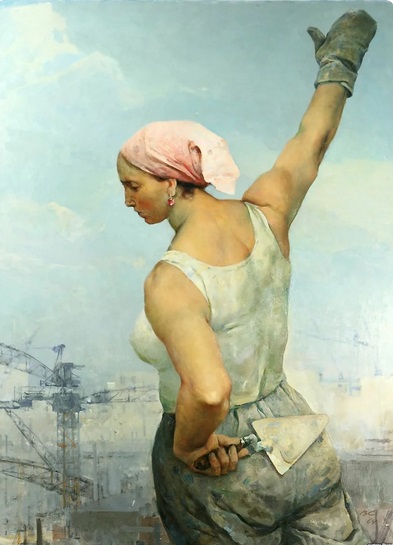 Серов. Строительница. 1964. Холст, масло. В 1964 году я, молодой инженер в провинции, уже несколько лет занимаюсь эстетическим самообразованием – читаю. Изостудию бросил. Сейчас и не вспомню, почему. Хочется думать, что из-за всё более проявлявшейся халтурности художника, там преподававшего. Он умудрился вывести нас в парк на этюды маслом, не проведя ни одного занятия по маслу, сразу после рисования гипсов карандашом. А перед этим я нечаянно подслушал на его персональной выставке в клубе его откровение товарищу, что он пишет грубыми мазками, потому что заглаживать теперь не модно. Серов, надо понимать, по его мнению, отставал от моды. Надо было понимать, что где-то существовала мода. – Мне это воняло приспособленчеством. И я б, наверно, принял сторону Серова. Сейчас же могу себе позволить судить, что у Серова ничего странного было не только относительно 1964 года, а и относительно академизма XIX века. "…возвышенность тематики, метафоричность, многоплановость и в некоторой степени даже помпезность” (https://farm69.ru/priznaki-akademizma-v-zhivopisi/). В общем – первые по жизни. Буржуи – в послереволюционной Франции, дворяне – непоколебленной декабризмом России, рабочие – в СССР. В СССР с его официальным принципом равенства, отмена партмаксимума произошла в тайне в 1934-м. "С 1934 г. официальная статистика перестала давать информацию о дифференциации оплаты труда” (https://1917.com/History/I-II/rmZH0i30fEkZSDSDxKo7uOw3aNg.html). Секретными были привилегии. Все следили, чтоб в материальном поощрении кто-то не вырвался слишком сильно. – Так что при известной слепоте Серов мог даже верить тому, что создавал исключительно сознанием. И тогда его произведения можно даже причислить к прикладному искусству (о знаемом). А если уж допустить его жизненную недалёкость, то он мог и не почуять какой-то фальши в мысли о реализме как общественной актуальности. Фальшь – что в чём же специфика искусства-то? Она-то, вообще, в экстраординарности. Положение “первый по жизни” – чем-то выражается тоже. Во взятом примере это физическая мощь… женщины. Как образ общественного приоритета трудящегося. Меньше фальши относительно специфичности искусства было б, считай реализмом чуяние того в социуме, что уже появилось, но чего ещё никто не почуял. Тут уже сильное приближение в выражению подсознательного идеала, наличие которого одно только и можно считать художественностью. И тогда Серов бы не заблуждался, что он реалист. Но тогда и Ляля б не взялась доказывать, что Серов с реализмом заблуждался. А она взялась. . "Взгляните, дорогой читатель, на серовского “Сталевара”. И скажите, что он ни капли не напоминает Вам роденовского “Мыслителя”. Своей позой, жестом, общим настроением произведения... Да и сам великий Огюст Роден (в 1906 году во время открытия экспозиции в парижском Пантеоне) говорил о том, что данная работа посвящается именно французским рабочим”.