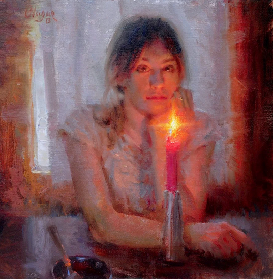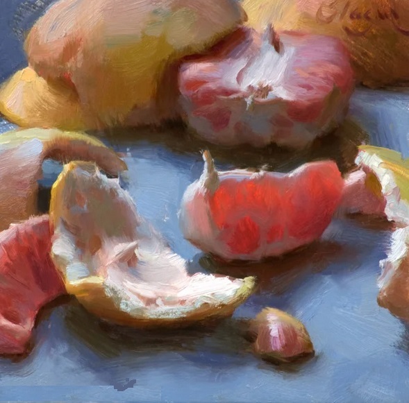 Клег. Светящийся грейпфрут. А я большую часть жизни жил так, что для меня грейпфрут еда привилегированных*, к которым я не принадлежу. И как мне пережить и здесь хвалу абы какой жизни, пусть даже есть тут абы какое кадрирование, правда, нет тут нарочитой торопливой эскизности мазков? – Я как-то недоволен. Ввели, правда, понятие новый импрессионизм – как раз для выражения радости жизни благополучных. Там по глазам бьющая красота. Но здесь и этого нет. . Может, это непрекращающийся романтизм, раз так мазки заглажены? Игра светотени, как гласит один шуточный сайт про 18 признаков романтизма.