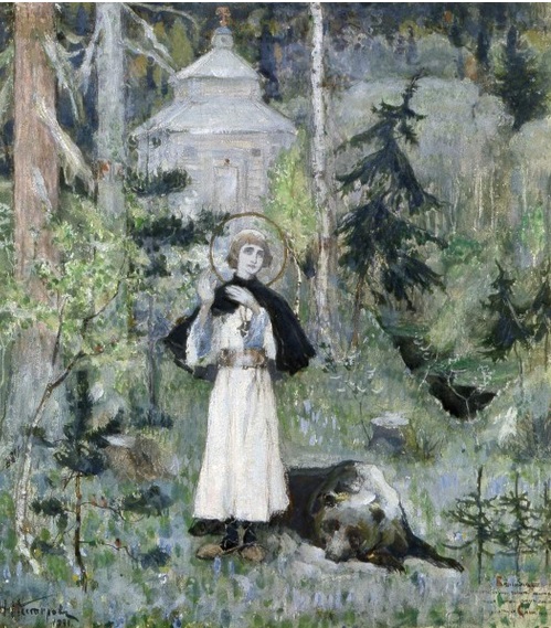 Нестеров. Юность преподобного Сергия Радонежского. 1892-1897. я могу только одну странность найти, сигнализирующую о ницшеанстве автора: край картины срезает крест на “небольшой церкви”, как сказано в “Житии”, предшественнице Свято-Троицкого монастыря.