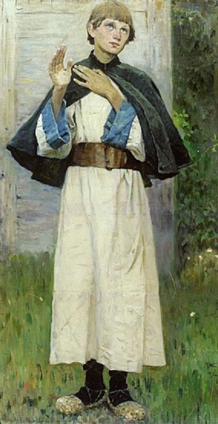 Нестеров. Отрок Варфоломей. 1889. Зачем-то полотенце перекинуто через плечо. Из десятков вариантов применения полотенца в христианской обрядности я смог выбрать только один, как-то подходящий к случаю "Свят муж, только пеленой обтереть, да в рай пустить” (https://k-istine.ru/base_faith/piety/peity_timonina.htm). Так и думается, что оно тут для того, чтоб его украсить – в пику мёртвости тела – цветами. Штаны тоже с цветами. В следующей картине о Сергии Радонежском