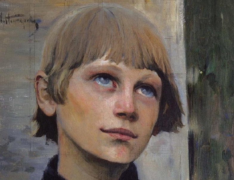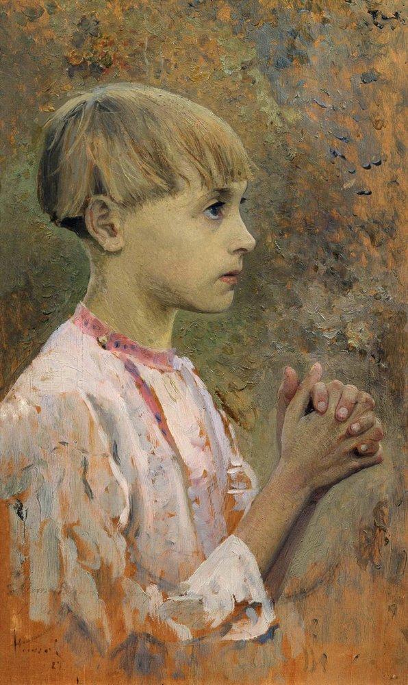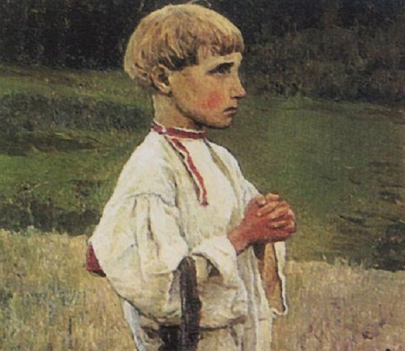 Нестеров. Отрок Варфоломей. 1889. Этюд. Румянец жизни на щеках и руках художнику не понравился. Он остановился на некой мертвенности лица. Правда, рубашка, так и играющая цветом жизни, не перешла в картину. Зато там играют – аж до невероятности – блики на штанах. Более жутка мёртвость живого в другом варианте картины.