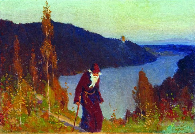 Нестеров. Труды преподобного Сергия. Триптих. 1896-1897. Тут, собственно, то же. Даже краски заиграли немного. . Ну что, читатель! Натягиваю я иномирие? 14.07.2021 г. * - Ницше Неистовый Дон Кихот с серебряным щитом, а Нестеров трусоват. Из-за зыбкости всего тут. То есть Нестеров – не ницшеанец.- А что, если эта бледная немочь красок – от негативного взгляда на религию извне на неё. Не от сочувствия. А как Маркс: "Чем больше человек приписывает себя Богу, тем меньше он оставляет себе”. И Маркс же богоборец. Так и Ницше против христианства. Можно мыслить их союзниками по этому вопросу. И, если Нестеров в религии разочаровался, то и ему впору к этим двум присоединяться. Если и не осознано, то подсознанием. Вот какое место “Жития” Нестеров взялся иллюстрировать, так сказать? – То, что перед такими словами: "В этом трогательном единении двух душ — убеленнаго сединами старца и малаго отрока — их общая молитва, как чистый фимиам, восходила на небо и достигла престола Всевышняго… Старец заключил свою вдохновенную молитву священным словом: аминь, и бережно вынул из пазухи небольшой ковчежец. Открыв его, он взял оттуда тремя перстами малую частицу святой просфоры, и, благословляя ею Варфоломея, промолвил: “возьми сие, чадо, и снеждь; сие дается тебе в знамение благодати Божией и разумешя Святаго Писания. Не смотри на то, что частица св. хлеба так мала: велика сладость вкушения от нея”” ( https://skazki.rustih.ru/zhitie-prepodobnogo-sergiya-radonezhskogo/).То есть Нестеров изобразил момент ДО "вкушения”! То есть Варфоломей на картине – БЕЗ способности к учёбе грамоты. И вся картина есть пейзаж его души, больного: осень. А что осень, видно по васильками: они цветут, начиная с июня, ну и по желтизна больших массивов леса. Тогда как пафос подглавы “Научение свыше” главы II, “Благодатный отрок”, требовало изображения весны, а не осени. Ученье, наверно же, происходило прошлой зимой, целая зима и весна продемонстрировали неспособность Варфоломея учиться. Нет, изображена осень. Сам факт неумения учиться “выбран” сказителем “Жития” не зря, а для иллюстрации христианской мысли: "…что никакого успеха, никакого знания, никакой способности не должно приписывать себе, но единственно Богу” (Там же). Но в “Житии” такое можно, потому что там движется сюжет. А в живописи движения сюжета нет. Мыслимо подумать, что художник может это преодолеть, дав для глаза зрителя какое-то предвестье. Но Нестеров не стал такого делать. Ему нужна была беспомощность Варфоломея. А поскольку тут явно не романтизм (с его пейзажем души автора), то перед нами пейзаж души героя. Больного немошью. Как осень больна зимой. Другое дело, что это всё – дела инспирированные подсознательным идеалом бегства из Этого мира, где есть смерть (одного этого достаточно для полного разочарования). Но в сознании-то могло быть другое – особая приверженность религии, "затаенное, спрятанное от мира чувство непосредственного и прямого предстояния человека пред Богом – идеал иночества” (https://romanovs-russia.blogspot.com/2014/04/blog-post_3.html). Такое, осознаваемое, переживание требовало совсем другого набора красок.