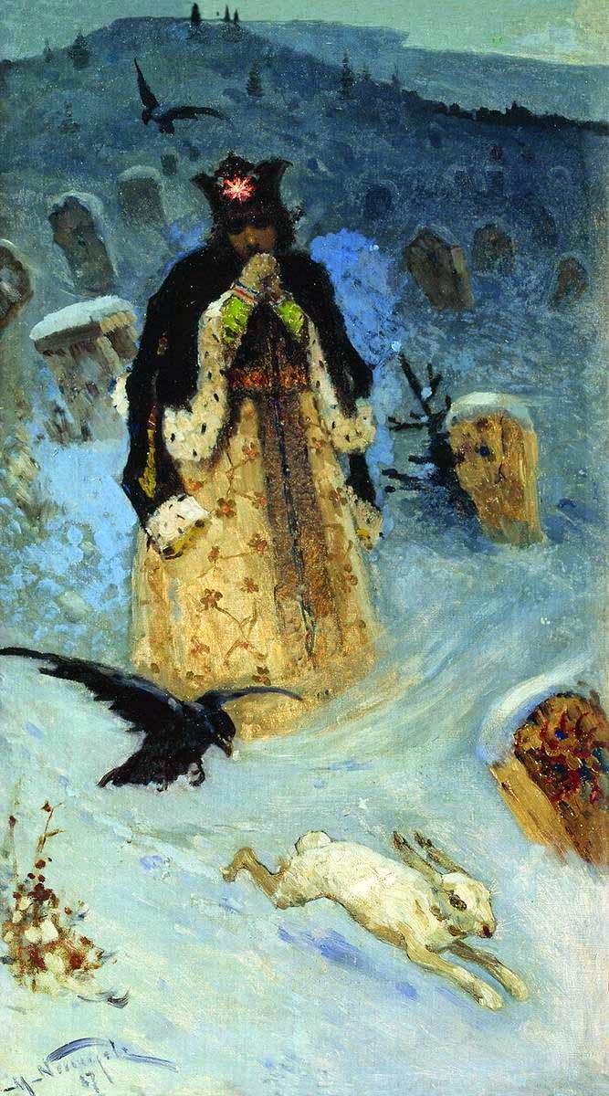 Нестеров. Юность преподобного Сергия. Эскиз. 1891. Тут крест ещё был весь. Правда мертвечине ничто не противоречит, чтоб уводить в метафизическое иномирие. Но, может, тут не катарсис (результат противочувствий) применён, а образ: цветом (никаким) – иномирие выражено… Что дело было ночью – то согласно “Житию”. (Невидимые бесы Сергия гнали с этого места.) И только в этой картине
