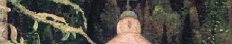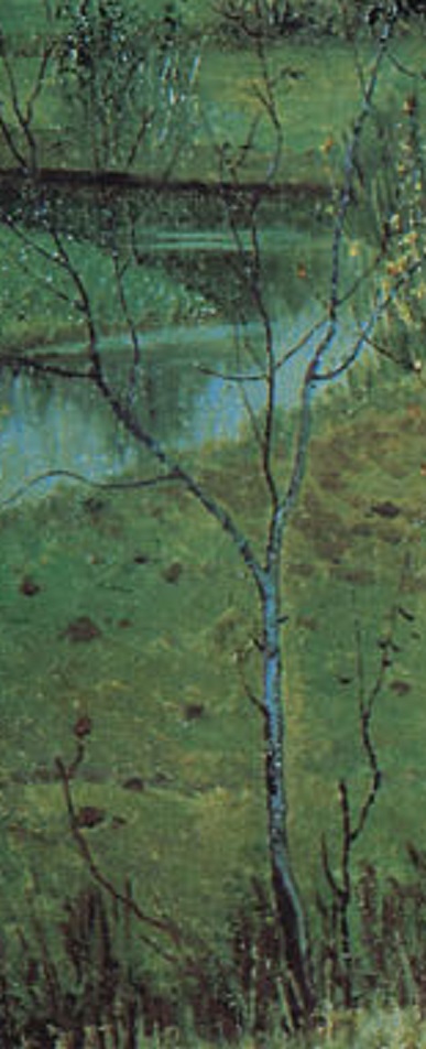 впервые есть промельк несовпадения отражения отражаемому. Хоть в принципе отражение темнее отражаемого, Нестеров этого не соблюдает. И до странности впечатления это не доводит. Большинство думает, что отражения и отражаемое соответствуют по цвету. Но вот крайняя правая голубая ель отражается не только гораздо более тёмной, но и гораздо более рослой. А дерево, через одно от этой ели, похоже, вообще не отражается. Ближайшая очередная огромная ель, окружённая рыжими деревцами, отражаются верно, но то, что следует за ними левее, уже вопрос, отражается ли вообще. Что это? Живописная небрежность, невнимательность или многозначительная странность, указание на подсознательный идеал бегства в метафизическое иномирие от Этой скучной, скучной и ещё раз скучной жизни (например, стандартов фабричных изделий эры индустриализации, что и породили реакцию в виде стиля модерн)? Здесь, чтоб противостоять какому-то мёртвому тону телесности и мальчика, и инока, тоже введено оживление на одежде: полосатые штаны у мальчика и узоры на ярко-синем облачении инока. Этот принцип оживляжа в пику цвету лица выдержан и тут.