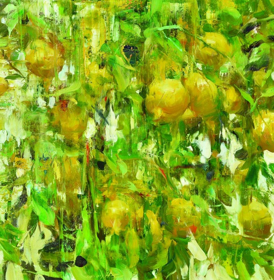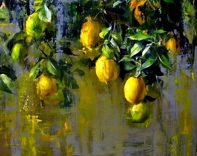Куанг Хо. Лимоны Мейера. Я вычитал, что это растение (селекционированное) – убийца других цитрусовых. И за то в США его уничтожили. – Так не есть ли на картине его некое начавшееся исчезновение образом его судьбы в США? – Но тогда о каком вдохновении художника можно говорить? Разве что, вспомнив про плавание сокровенного из сознания в подсознание и обратно. "Пока не требует поэта…”. Про Куанга Хо пишут, что он не ищет "предвзятого художественного содержания в мире” (https://artliveandbeauty.blogspot.com/2020/08/artist-quang-ho-vietman-artist.html). Что для него важно соотношение цветов или ракурсов. Написано это к картине такой.