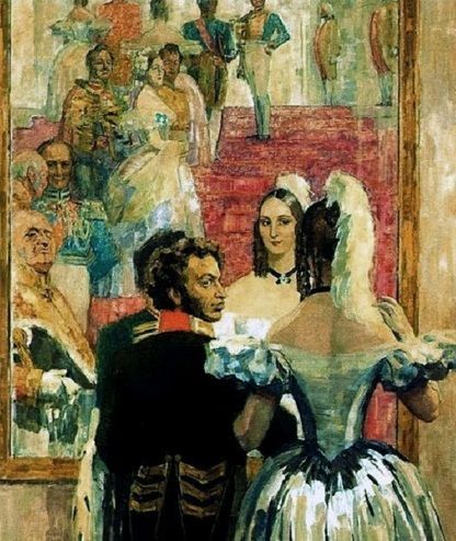 Ульянов. Пушкин с женой на придворном балу перед зеркалом. 1937. Я ответил: “Один** – как все восхищены красотой Натальи Николаевны*. И это очевидно. И потому это даже околоискусство, ибо иллюстрация всеми знаемой мысли, а не усиление её до степени экстраординарного, то есть даже не прикладное искусство”. В ХХ веке странным было б счесть экстраординарностью умение художника достигнуть похожести (как тут – Пушкина). Я где-то лет в 7-8 срисовал пером и фиолетовыми чернилами Льва Толстого за конторкой, а Ленина – даже и просто по памяти. Так за экстраординарность можно было счесть разве что то, что нарисовано было на газете (это было сразу после войны – бумаги купить было негде в нашем городке). Но оказалось, что это художник Ульянов, принятый в своё время аж в “Мире искусства”. А туда иллюстраторов всеми знаемого, вроде не брали. Или он тогда им и не был?