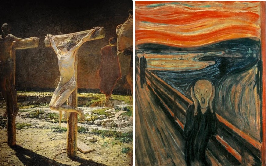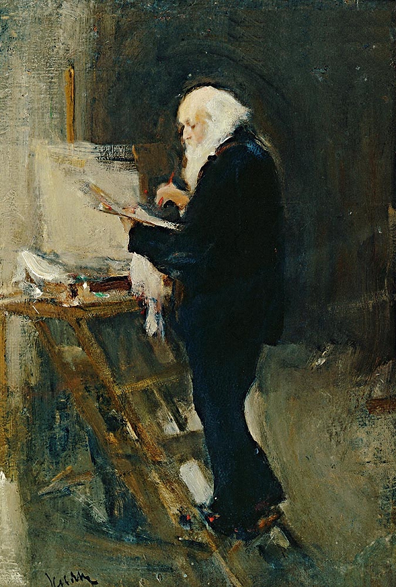 Ульянов. Художник Н. Н. Ге за работой. 1895. Обратите внимание на размашистость письма. Импрессионизм какой-то по форме. (Импрессионизм тогда был в фаворе.) И только в нескольких местах резкость. На переносице и носу, на левом рукаве и на коленях, хоть те, наверно, дрожат: как бы не упасть. Мне это представляется насмешливым образом того, как Ге хочет стать экспрессионистом и всё-таки не может. Что-то мешает ему полностью перешагнуть натуроподобие. Вот сравните два крика: Ге и Мунка.