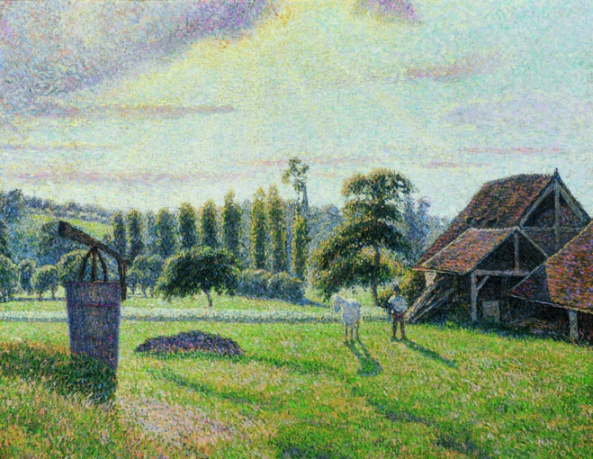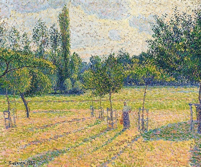 Писсаро. Поздний вечер на нашем лугу. 1887. я подумал о ней совсем не так. Бессилие какое-то солнца. Пусть и не такие уж длинные тени, но солнце какое-то полупотухшее. И люди, видно, смирились давно. Если теория тепловой смерти Вселенной в середине 19 столетия была уже разработана, то перед концом века в культуре вполне могло зародиться настроение, ей подобное. Или, наоборот, ей вполне соответствовала философия Шопенгауэра: "Жизнь во временном потоке представляется цепью безотрадных страданий, сплошным рядом крупных и мелких невзгод, то есть жизнь всего лишь эпизод, нарушающий покой абсолютного бытия. Жизнь может и должна заканчиваться стремлением к подавлению “воли к жизни”, превращением в ничто. Только в единстве со смертью жизнь может реализоваться как целое. Небытие является основой для дальнейшего существования” (https://desinfection.livejournal.com/15315.html). И некоторые “измы” вполне оказались способны выразить такое настроение безразличия, бесчувствия. Почти буддистская нирвана. Всё зыбится как марево предпоследних секунд мира.