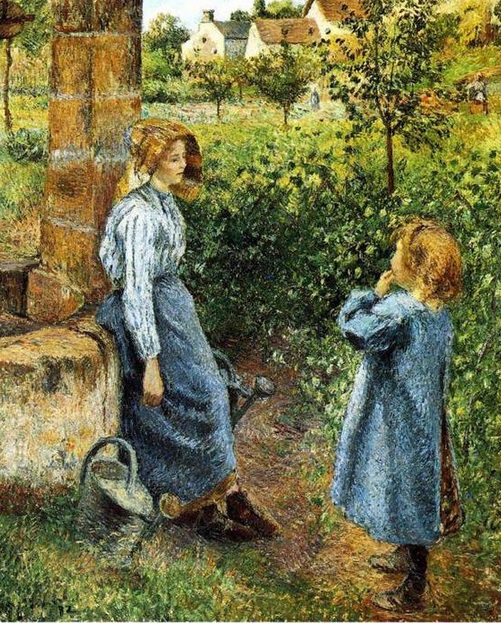 Писсаро. Молодая женщина и ребенок у колодца. 1882. Здесь тоже не во всех местах пуантилизм (в блузке женщины, в её головном уборе, в камнях колодца, собственно, и в зелени, и в домах, и в небе). Только юбка женщины и платье девочки мерцают. В результате он пуантилизм изгнал вообще.