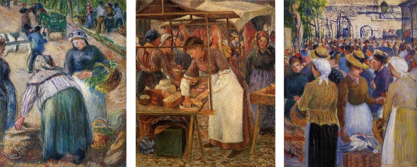 Писсаро (слева направо): "Картофельный рынок на бульваре де Фос в Понтуазе" (1882 г.), "Продавщица мяса" (1883 г.), "Рынок домашней птицы в Жизоре" (1889 г.) От хвалы, правда, отпали сильно действующие световые эффекты. Потому он, наверно, ещё раз соблазнился – дивизионизмом (первая репродукция). От которого тоже пришлось отказаться по уже указанной причине. Её, правда, придётся натягивать на такие жизнерадостные вещи.