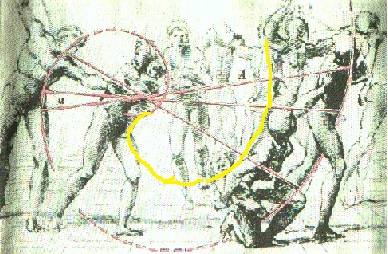 Подготовительный эскиз. Пунктирная часть спирали вверху и внизу Рафаэлю не принадлежит. Высокое Возрождение было реакцией на крайнюю безнравственность (Раннее Возрождение), в какую впало общество от расшатывания веры из-за откапывания античных статуй и не уничтожения их, как требовали самые принципиальные служители церкви. "Один итальянец, живший в эпоху Возрождения, имел обыкновение замечать, когда ребенок говорил что-нибудь умное: “Этот долго не проживет”. Во все времена отцы говорили своим сыновьям, как Лютер: “Пусть уж лучше у меня будет мертвый сын, чем непослушный”… У людей прошлого потребность изуродовать, обжечь или сжечь, заморозить, утопить, с силой швырнуть или тряхнуть ребенка постоянно находила проявление. Ханс резал щеки новорожденным мальчикам. Роберт Пемелл рассказывает, что в Италии и в других странах в эпоху Возрождения родители, бывало, “прижигали шею горячим железом или капали воском с горящей свечи” на новорожденного ребенка, чтобы он не заболел “падучей болезнью”” (https://www.u-mama.ru/forum/gossip/everything/11284/). Крайняя жестокость естественно породила реакцию. Натурализмом изображения нас же самих, ужасных, художники рассчитывали на шок, на содрогание зрителей, что являлось залогом улучшения нравов. И достигался идеал гармонии низкого (ужасных современников) и высокого (их всё же содрогания-сочувствия страданиям других). Но можно ли согласиться с такой похвалой спирали: "Эжен Делакруа… писал…: "В сочетании всех чудес грации и простоты, познаний и инстинкта в композиции Рафаэль достиг такого совершенства, в котором с ним еще никто не сравнился. В самых простых, как и в самых величественных, композициях повсюду его ум вносит вместе с жизнью и движением совершенных порядок в чарующую гармонию". В композиции "Избиение младенцев" очень ярко проявляются эти черты великого мастера. В ней прекрасно сочетаются динамизм и гармония. Этому сочетанию способствует выбор золотой спирали за композиционную основу рисунка Рафаэля: динамизм ему придает вихревой характер спирали, а гармоничность - выбор золотого сечения как пропорции, определяющей развертывание спирали” (https://vuzlit.ru/531097/zolotaya_spiral_kartine_rafaelya_izbienie_mladentsev). Меня смущает произвол выбора точек для прямых: подбородок левого убийцы, неопределённые точки на его торсе и левой ноге, пересечение левых ног бегущих на первом плане, неопределённая точка на животе правого убийцы на первом плане, неопределённая точка на его правом плече. Я могу ещё более обоснованную, жёлтую, спираль провести. И я не уверен, что две центральные женщины специально ради спирали не сделаны в компьютерном режиме рисования более бледными, чем те, кто слева и справа от них. На главном эскизе Рафаэля никакие спирали не чувствуются. Делакруа слушать надо тоже с осторожностью. Он романтик. Те бегают в свой прекрасный внутренний мир вон из ужасного мира внешнего. Что ему стоит нравящегося всем Рафаэля зачислить в сообщники себе, распространяя похвалу на композицию с применением хороших слов "чарующую гармонию". И что стоит цитирующему его автору ассоциировать это со спиралью. Может вовсе не спиралью (не существующей на самом деле) обеспечен динамизм как натурализм движения, а позами. Я автора статьи понимаю. Ему надо присоединить к общепринятому для Высокого Возрождения (и Рафаэля) слова “гармония” слово 