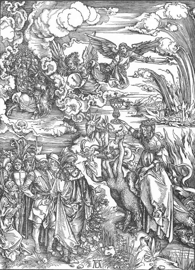 Но гуманистическая тенденция процитированного современного интерпретатора очевидна. А Дюрер, этот представитель трагического героизма, совсем не гуманист, особенно в том, испорченном в конце Возрождения, смысле, в смысле вседозволенности со стороны одной из всегда пары главных противостоящих идеологий. До первого восстания против католического гуманизма оставалось 30 лет, до первых погромов - 20. О чём верхняя часть этой гравюры (да и весь цикл) предвещает. Теперь другие доводы касательно ренегатства Дюрера относительно Высокого Возрождения, касательно гармонии тела и духа, касательно приземлённости небесного. Нет, Дюрер не прыгнул вспять во времени, в готику. Он не загробные ценности воспевает, не бесплотность, не универсальность душ пред Богом. √ Он за личностность этих переживаний. Он рисует именно свои фантазии. Субъективные. Дворжак делает такой вывод из того, например, что в изображении на первой гравюре