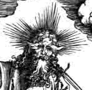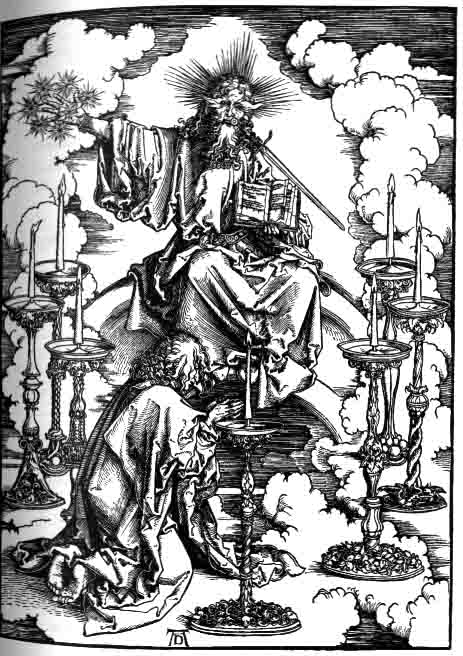 Видение семи светильников (Откр. 1,12-3,22) изображён сам пророк, автор ⌠Апокалипсиса■: ⌠Действие происходит где-то в заоблачной выси: на причудливых облаках стоят светильники и среди них возникает радуга с восседающей на ней фигурой Первого и Последнего, перед которым преклонил колени и сам пророк; таким образом, это ≈ видение не Иоанна, но самого художника■ (С. 230). Вполне естественно считать, что и все остальные 14 гравюр иллюстрируют тоже видения ⌠самого художника■. А как же быть с 13-й гравюрой: ⌠в нем мы можем предположить самого Дюрера■? Я думаю, что Дворжака там занесло. Вот автопортрет Дюрера тех лет.