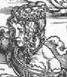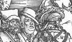 А вот как об этих же персонажах пишет Макс Дворжак: ⌠Дюрер представил вавилонскую блудницу в облике прекрасной венецианки, изображая ее царственно и обольстительно, как некое волшебное видение; она подманивает к себе усталого странника, показывая ему кубок. При этом она является не провидцу, как в Библии, но целой толпе мужчин и женщин, одетых по моде того времени. Но, кажется, только один восхищается ею ≈ монашек с широко открытыми глазами и сложенными в трубочку губами, молитвенно опустившийся перед нею на колени. На других лицах написаны робость, испуг или протест. Боязливо косятся на нее паж и дама. Презрительное и упрямое выражение застыло в глазах крестьянина. Уперев руки в бок, в центре группы в уверенной позе изображен мужчина, критично и свысока вглядывающийся в блудницу, в нем мы можем предположить самого Дюрера■ (С. 234-235). Сравним: ⌠робость, испуг┘ протест┘ Презрительное и упрямое выражение■, слова гораздо более верные, чем: ⌠Прекрасна девушка■. Увеличим её лицо. Посмотрим, насколько оно прекрасно. При том, что красивое женское лицо Дюрер умел-таки изобразить.