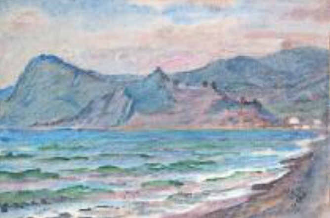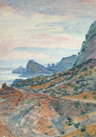 Бруни. Коктебель. 1913. Бумага серая, акварель, графитный карандаш. Правда, в молодости бледнопись у Бруни являет чуть не единственное исключение. Возможно, бледность вот этого “Коктебеля” связана с адекватным отображением безводности этого места, которое он увидел, там впервые оказавшись. А адекватность могла прийти ему в голову ради повторения: он в 1913-м изобразил "природу восточного Крыма, предугаданную еще в детском рисунке 1903 года" (Сарабьянов). То есть ему запомнился тот ажиотаж в детстве (как он мог предугадать?!), вот он и повторил эту сушь. И можно, соответственно, предположить, почему Бруни изобразил Бальмонта голубым и бледным – тоже ради адекватности с его известным читателям внутренним миром когдатошним.