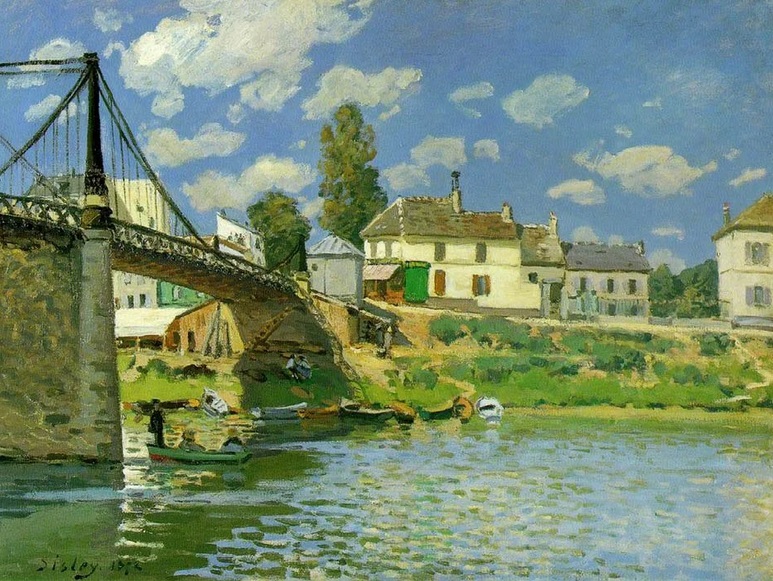 Кейн. Англия 19 век. Речной пейзаж с мостом и фермерским домом. И тогда как-то вяжется определение: "выглядит уютным местечком, жизнь в котором течет неторопливо и счастливо”. А мне пейзаж Сислея напомнил послевоенный Каунас. В 1948 году я там появился. Город, правда, не был разбит, и в начале, и в конце войны войска и фашистские, и советские его обошли. Город хоть и был до войны столицей Литвы, но я чуть не ахнул от похожести: точно так же выглядела дико заросшая набережная у Алексотского моста, вид на дом Наполеона. Да и мазки какие – нарочито небрежные. Чем не абы какая жизнь? Но сияние, да, у Сислея сильнее. Но за грубость картины импрессионистов не покупали. А вот, казалось бы, и признание, что абы что изображается: