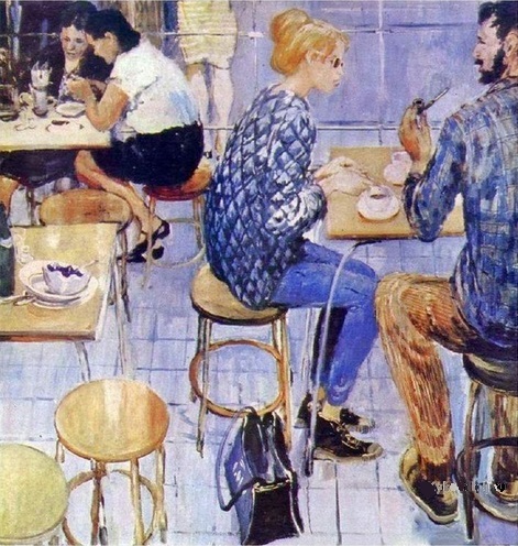 Пименов. В кафе. 1971. А вот наблюдение этого человека: "…ощущение, что дамы слева что-то смотрят на телефоне. :) Меж тем, на дворе 1971-ый”. Тут надо сказать, что я человек консервативный. Настолько, что у меня мобильный телефон какого-то древнейшего образца. А и на нём я только и умею, что позвонить или ответить на звонок. Всё. Больше никаких других функций я не знаю. Ну зарядку ещё знаю. И звонят мне по этому телефону, исключая рекламщиков, раз в месяц приблизительно. То есть не мне знать, насколько смотрение в телефон актуальная вещь теперь для нынешних людей. Но я случайно узнал. У меня в голове застряли слова внучки, что надо женить моего сына. И я подумал: правда. Я его женю. – А я не владею местным языком, и у меня категорически нет знакомых. Но есть примелькавшиеся. (А тут русскоязычные каким-то чутьём по лицу определяют других русскоязычных.) И вот на одном из созерцаний заката на берегу моря я увидел на лестнице на пляж под обрывом большущую деваху, сыну моему под стать. Русскоязычная. И на завтра её видел. И ещё. И потом она пропала. На год. – Через год её встречаю идущей к той же лестнице. Подхожу. Знакомлюсь. И предлагаю ей выйти замуж за моего сына. А она, оказалось, просто из вежливости говорила со мной, глубоким стариком. И решила это знакомство прекратить. Но я-то не знал. И пробовал разговор в другие дни продолжить. Это оказалось не просто хотя бы потому, что у неё уши заткнуты наушниками, она, слышно, слушает музыку или разговаривает. Вся там и на оклик не реагирует. – Так я узнал об огромной роли мобильника. Заинтересованность двух дам за дальним столиком на картине действительно не обычная. Люди ж кушать пришли. Ан нет. Не едят, и видно, что весь свет для них пропал. Как бы землю под собой не чуют. Что подтверждается другой странностью картины: всё видно сбоку, а пол – сверху. Характерная для советских людей сосредоточенность на сути дела в ущерб окружающим дело обстоятельствам. Если строят БАМ, то строят саму железную дорогу, а не дома, и живут в бараках. Если устроено кафе, то исключительно для приёма пищи. А сумку оказывается не куда девать: на плече она мешать будет кушать. Так не гардероб же устраивать. Пусть на пол клиенты поставят около ног. – Пол может быть грязным от ног предыдущих кушавших. – Ничего. Её можно потом отряхнуть. И никаких официантов. Самообслуживание. (Что мы и видим: загородку между столом для сервирования и залом; если наберётся очередь набирающих еду на подносы, то загородка организует порядок очереди.) В нашем случае там оказалась только одна женщина. Она, конечно же, тоже увлечена выбором блюд. Но увлечённость едой – это низменное переживание. Оно официально третьестепенно. Соответственно и внимание к той женщине – верх её обрезан краем картины. На переднем плане, соответственно, тоже увлечены разговором и прекратили кушать. Левая рука “его” замерла, не донеся хлеб до рта. Руки “её” замерли над чашкой кофе на столе. Абы какая жизнь*! И – ей-то и хвала, такой непритязательной. И поётся хвала, как всегда у импрессионистов, силой света всего тут. А что это ну очень уж непритязательная жизнь… Ну, такова советская планида. Живём не настоящим – будущим. Во всяком случае – официально. Только в будущем, в капитализме мы обругаем всячески ту жизнь как бедную. А пока – поём хвалу. С подначкой. Но её не заметят. 19 сентября 2021 г. * -