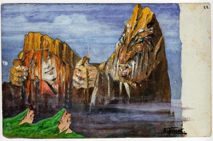 Нольде. Почтовая открытка № 28 из серии “Волшебные горы”. 1901. А поскольку детство он провёл в большой бедности, то первый осознаваемый перескок был в какой-нибудь левый идеостиль. Например, в наивный символизм – "1901-ым годом датируется первая значительная картина Нольде, которую он назвал "Перед рассветом". Здесь на фоне развертывающегося где-то внизу идиллического пейзажа, восходящего к немецким романтикам 19 века, среди отвесных скал парят в воздухе фантастические монстры – полурептилии, полуптицы, полулюди. Они порождены тьмой и с рассветом должны исчезнуть” (https://s30556663155.mirtesen.ru/blog/43476337119/Emil-Nolde.Hudozhnik-iz-krestyan.-Natsist-i-zhertva-natsizma.). – Жаль, увидеть не возможно. Но с ужасом настоящей действительности так не справишься. Можно только удивляться, как быстро Нольде дошёл до совершенно крайнего отчаяния. Его евангельские картины настолько кричащие, насколько евангельские повествования оптимистичны. Вот Пятидесятница. Иисус в виде огоньков поместился на апостолах, внушил им способность говорить на языках представителей народов, бывающих в Иерусалиме, чтоб распространить учение по всему свету. 3000 тысячи иерусалимцев, бывшие свидетелями этому, крестились. Ну полное вдохновение начинающейся и имеющей далёкие перспективы веры. Книга “Деяния”, это описывающая, имеет массу конкретностей, которые историей подтверждены. Так надо, по-моему, полностью Нольде разочароваться в христианстве, чтоб он так страшно изобразил тех, осиянных.