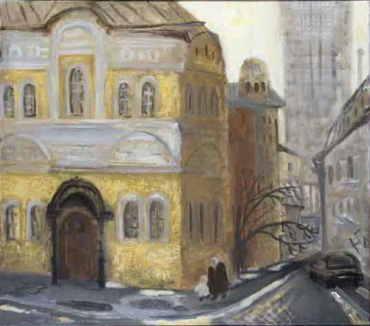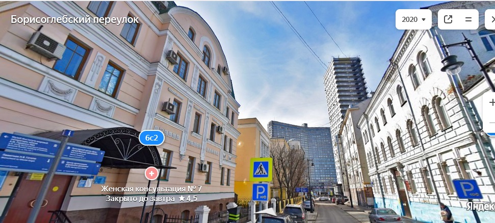Глебова. Борисоглебский переулок. 2003. Голос умиления. Так что: без голоса корявостью живописи надо выражать умиление? В доме справа окна этажа, что под верхним, даны с нарушением перспективы. Нет сходимости линий окон и на уходящей от нас стене дома, что в центре картины. И нарочито неаккуратно нарисованы большинство окон. Неизящно и дерево и не только в силу естества своего, корявого. И как всё смазано, нерезко! И какой монстр эта бабушка в шубе. И припаркованная на тротуаре легковая совсем без блеска, присущего ей в натуре, изображена. – Неужели вся эта халатность должна уравновеситься старинностью дома, что главный тут? – Как-то не думается. Он внутри со старинной же планировкой, неудобной (мало принято в России, оставляя фасады, делать внутри современную перепланировку). Так что и эта старинность подана с плохой стороны. И какой кривой и узкий этот переулок! Вот это место на Яндекс-карте ныне, спустя 17 лет: