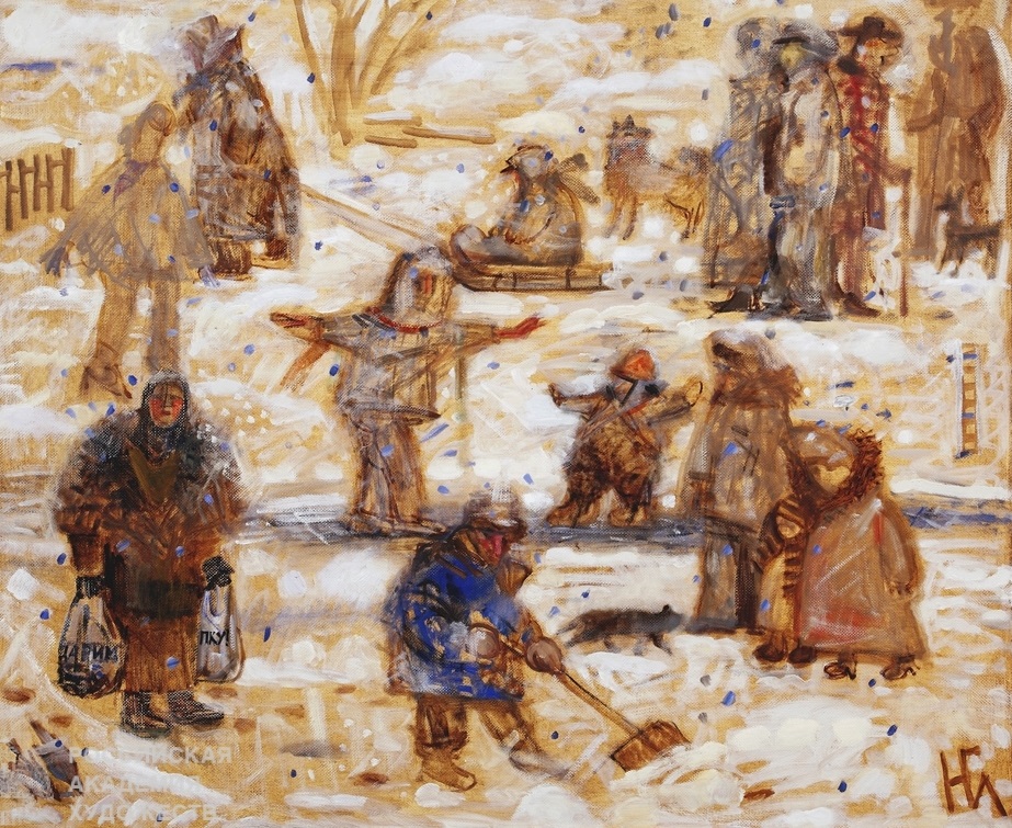 Глебова. Люди на снегу. 2013. А тут не просто люди на снегу, а как в Москве утром не дают понежиться в постели и подремать утром, потому что фанерной лопатой сгребают снег. Самой Глебовой слова. Она словами акцентирует нехорошее, а тоном – хорошее. Так изображением нехорошее выражено чуть не крайней неаккуратностью кисти, тем, что лица, собственно, как бы лень было прописать, руки, обувь. А в чём любовь ко всему этому, родному? Как-то ускользает… Но есть. И – тоска, что всё так сложно, что не даётся постижению. . Явный признак подсознательности идеала простейшей, мещаннейшей жизни. . А ведь говорят иные, что это – путь к самоликвидации России. Что Россия может быть или великой, или не быть. А какое ж величие в мещанской жизни? – Никакого. Для того и национальная идея в конституцию не вписана – чтоб подвести основу под самоликвидацию России. . Но какая сладкая тоска – глядеть на недопонятные картины… 17 октября 2021 г.