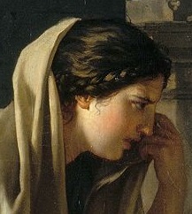 Внимательно жалеющая. Удивлённо узнающий. позы благородны и натуральны; он умеет рисовать; умеет накинуть драпировку и расположить ее красивыми складками; колонны его хороши, не будучи излишне яркими. Я предпочел бы, чтобы тела были не столь напряжены, мускулы — гибче. Сделайте мысленно архитектуру более глухой — возможно, она будет лучше. Не буду говорить о воине, потрясенном изумлением, о женщине, подающей милостыню, об этих скрещенных руках — я испортил бы удовольствие себе и огорчил бы художника, но все же я не могу не сказать: “Неужели ты полагаешь, что Велизарий недостаточно унижен тем, что решился принять милостыню? Неужели он должен еще и просить ее? Пусть его протянутая рука обнимает ребенка, или пусть, воздев ее к небесам, он обвиняет их в жестокости”. Впечатление, что Дидро находится в плену классицизма первой волны и не одобряет у Давида выход вон за норму: "важнейший элемент эстетики классицизма – учение о разуме как главном критерии художественной правды и, следовательно, прекрасного в искусстве; это сразу же налагает на искусство печать холодной рассудочности” ( https://studme.org/37456/etika_i_estetika/klassitsizm).Хорошо "лица выразительны, без жеманства” и плохо "Неужели он должен еще и просить” милостыню. Тогда как достоинство Давида, наоборот – "неподдельное воодушевление идеей” (Там же). Тут – идеей упрёка со стороны Разума за несправедливость. (Велизарий был предан императору Юстиниану, а тот ревновал к его военной славе и поддался навету, что Велизарий ему не верен. Немилость фактически длилась лишь год, а дальше просто было замалчивание заслуг. Но легенда абсолютизировала несправедливость и довела до ослепления Велизария.) До неприятного градуса морализирование, назидательность и театральность классицизм второй волны, знаменуемый Давидом, дошёл позже. Но Дидро до этого не дожил (он умер через 2 года после первого упоминания о Давиде в 1781 году), но зародыш театральности укусил. Так что первой проверки не выдержала способность Дидро "угадать исторический момент современной художественной жизни”.