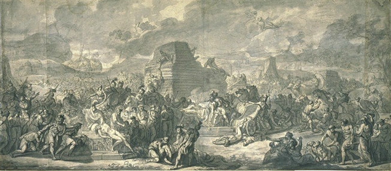 Превосходный эскиз; оставляет прекрасное впечатление, полон чувства. Насчёт чувства – это опять в ту же степь: "неподдельное воодушевление идеей”. Ну ясно: если барокко было бурное, а классицизм первой волны – в пику – чинный, то Дидро в конце существования этого чинного чутко хвалит опять чувство (греки ж обижены на своих богов, что те распорядились Патроклу быть убитым, и художник тоже негодует на несправедливость). Всё чётко у Дидро с похвалой.