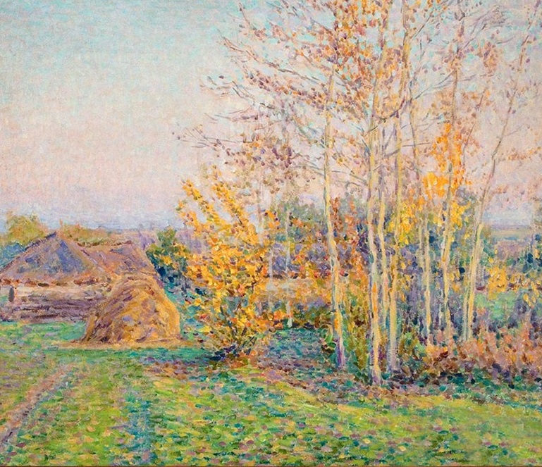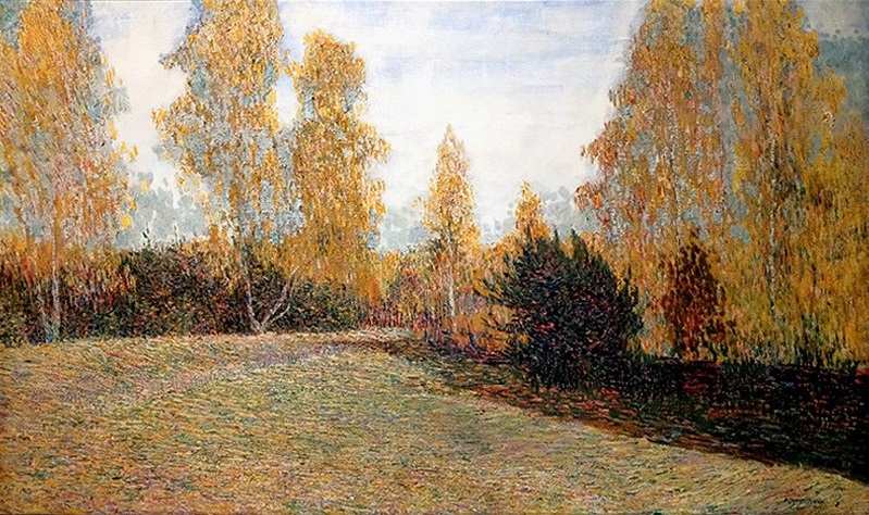 Мещерин. Золотая осень. 1908. Вам, читатель, наверно, уже надоело однообразное комментирование. Что вам до того, что мне пеняют за само произнесение слов “формула идеостиля импрессионизма”. Что вам до того, что я защищаюсь от таких пинков. А тут, вот, уже и не сообразишь, что отнести к тематической мизерности… Не начало ли тут перехода в новый импрессионизм, хвалящий прелесть, а не абы какую жизнь? Или тут она всё ещё абы какая, умирающая перед зимой природа…