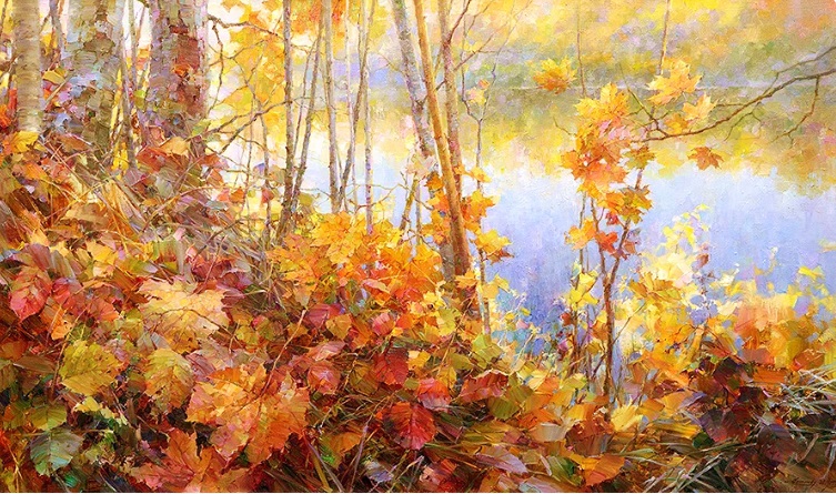 Тимошин. Дивная осень. 2013. Как говорят на такое: красяво. Ибо неглубоко и не волнует. Так как и сама экстраординарность – как живое – за века и века стёрлась. Разве что… Раз читал у Гениса. Он эмигрант в США. А там засилье абстракционизма. Так когда он приезжал в Россию, то, писал, даже передвижники (это искусство, приложенное к идее усиливать сострадание к народу, освобождённому от крепостного права без земли) услаждают его глаз. А когда Тимошин хочет приблизиться к волнующему историческому,