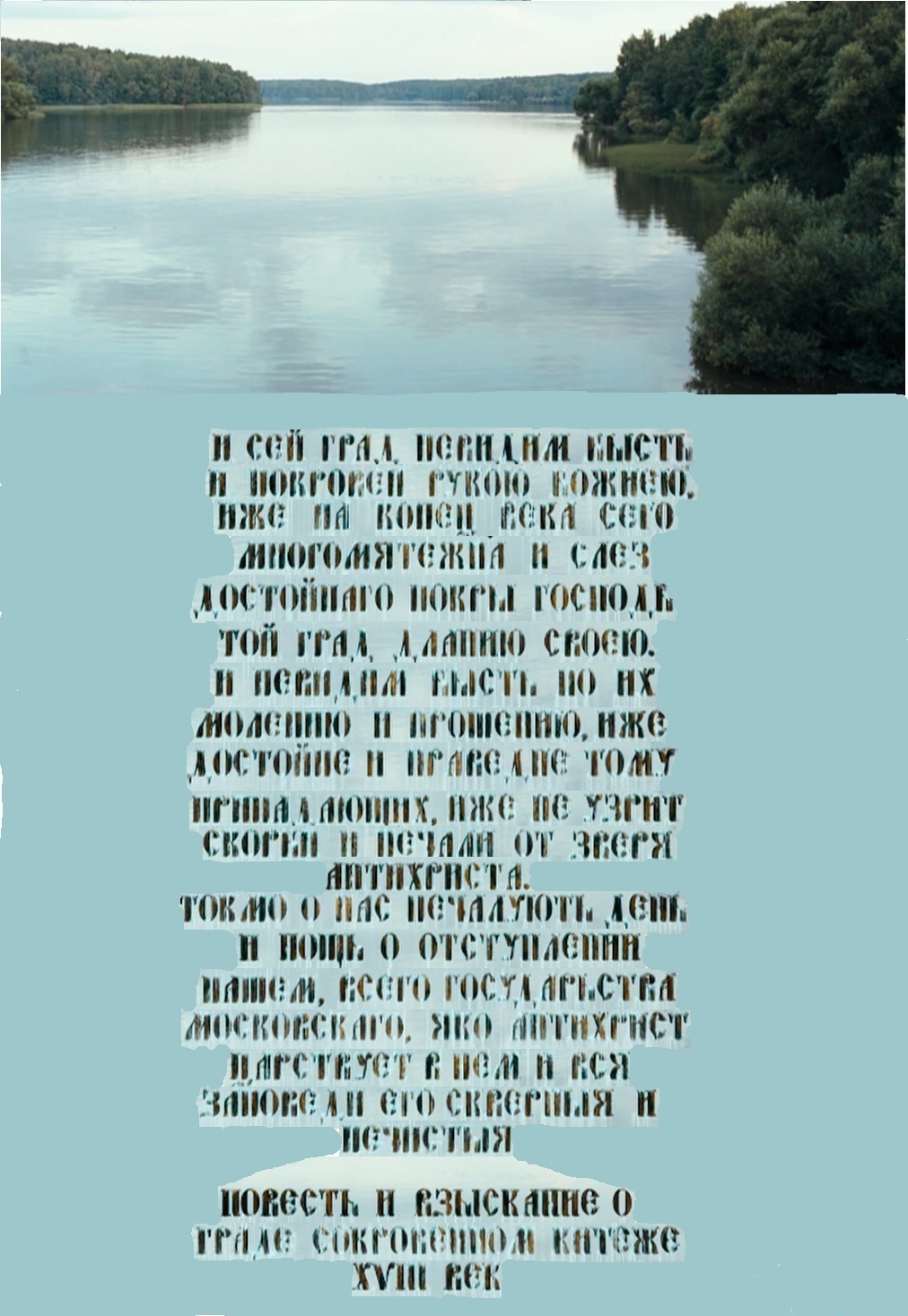 взгляд её снят таким, что Бога для неё больше нет. Как и режиссёру. И потому естественно было назначить вдруг какой-то Всемирный Потоп, губящий всех. В смысле – от имени режиссёра – зачем мне Этот мир, если в нём принципиально нет победы Добра над Злом. И выживает – юродивый во всё-таки сохранившемся Этом мире. И не верьте вроде древнему стилю букв финальной надписи над гладью озера, что всё – опять по-христиански: