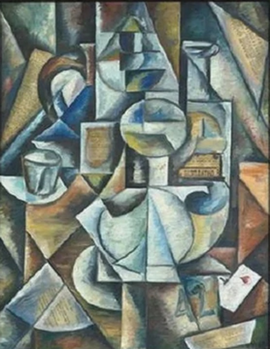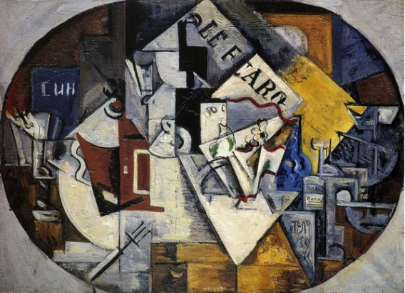 Удальцова. Натюрморт на столе. 1913-1914 гг. Холст, масло, коллаж. Что-то с химией как наукой связано? "Человеческий облик, бутылка, гитара, да и все, что угодно, исчерпывает себя не в простом созерцании, но только в мысли. Тот, кто хочет изобразить их с ее помощью, в их "подлинной действительности", в их объективности, тот не должен останавливаться и на световых оттенках, которые дает только субъективное впечатление, напротив, он должен рисовать их монохромными, то есть так, как они существуют "в себе", каков их "локальный цвет". Отсюда часто однотонные цвета кубистов. Всякой субъективной видимости восприятия и перспективы, всего, относящегося к иллюзии, следует избегать; этому у них служат и коллажи, то есть введение в картину ненаписанных предметов, таких, как листы газет, лоскутки, клочки клеенки и т. п.” (Там же).