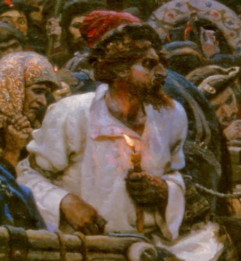 Это ж святой фанатик какой-то. Соответственно, не зря на заднем плане храм Василия Блаженного. Это народный храм, не в Кремле он, куда входа народу нет. Так хвалу натуроискажению можно проследить на нём: "Даже красочный храм Василия Блаженного выглядит бледным в этот трагический день. Художник осознанно выбрал приглушённые тона для изображения сооружения" (https://olga-dubova.ru/drugoe/surikov-utro-streletskoj-kazni-opisanie-kartiny-analiz-sochinenie.html). Сам Бог, мол, на стороне казнимых. И искажение "приглушённые тона” – хвалят. Почему я говорю про искажение? – Потому что даже в пасмурный день этот храм в действительности более пёстро выглядит, чем у Сурикова.